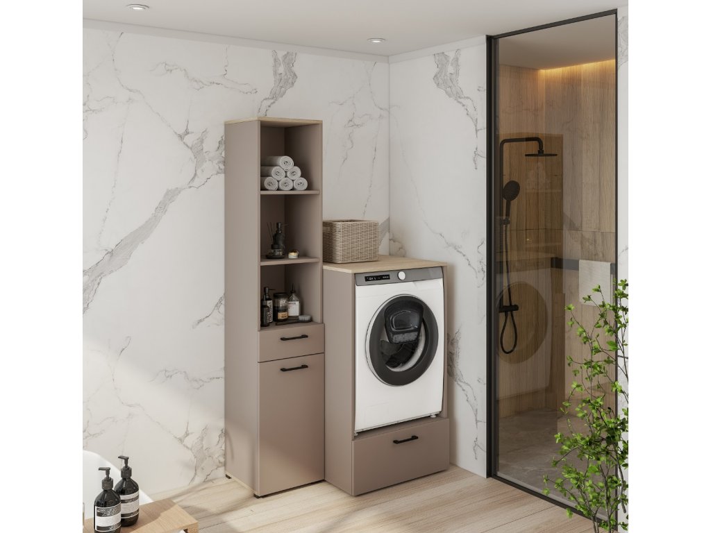 Sestava obsahuje: | Skříňka na pračku - rozměry (š,v,h): 67 x 117 x 67 cm, vysoký regál - rozměry (š,v,h): 40 x 197 x 40 cm |