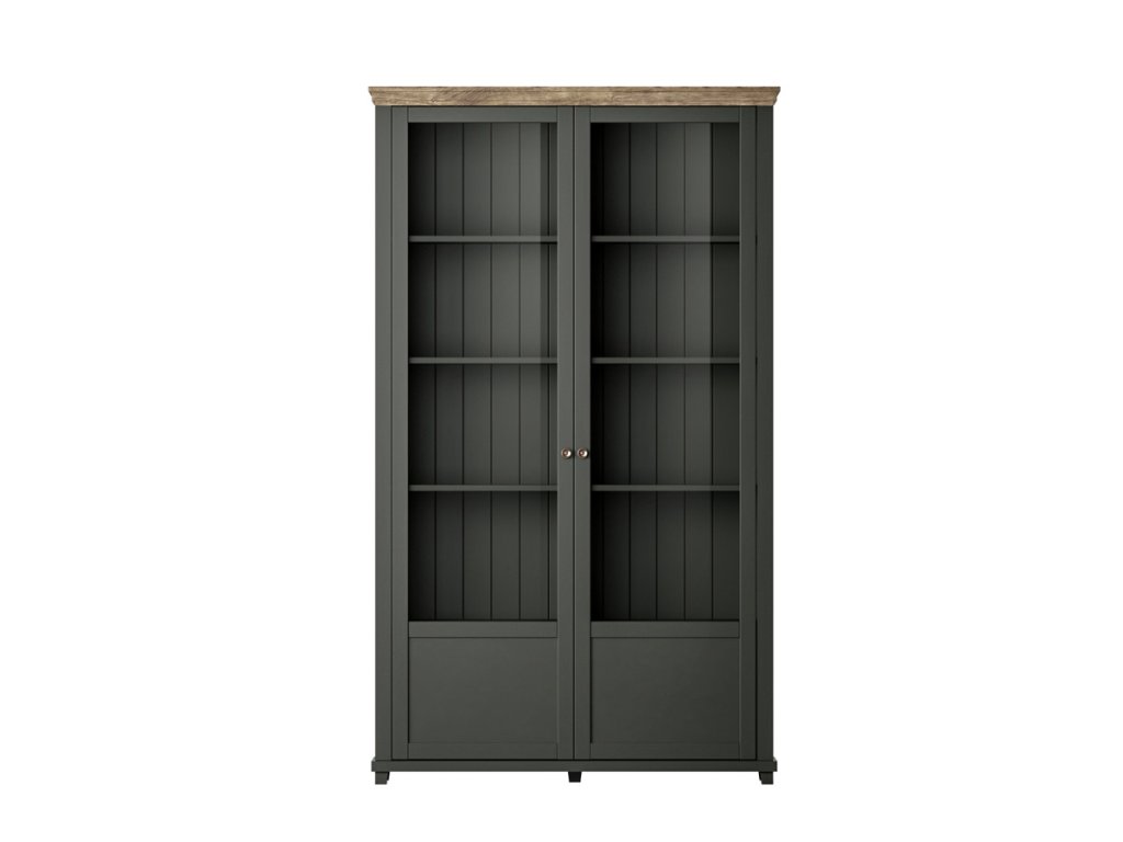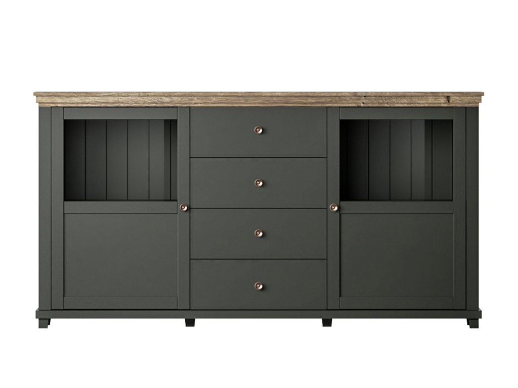 Korpus nábytku je vyroben z LTD desky, která se snadno udržuje. Přední části jsou vyrobeny z kvalitní MDF desky, která je potažena fólií. Tmavě zelená barva v kombinaci s imitací dřeva dub lefkas vytváří mimořádně stylové spojení barev. Malé úchyty ve zlatém barevném provedení dodávají nábytku elegantní charakter.