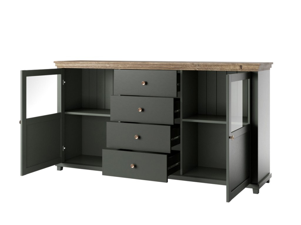 Korpus komody je vyroben z LTD desky, která se snadno udržuje. Přední části jsou vyrobeny z MDF desky, která je potažena kvalitní fólií. Tmavě zelená barva v kombinaci s imitací dřeva dub lefkas vytváří mimořádně stylové spojení barev. Malé úchyty, které jsou ve zlatém barevném provedení dodávají nábytku SABRILA elegantní charakter.