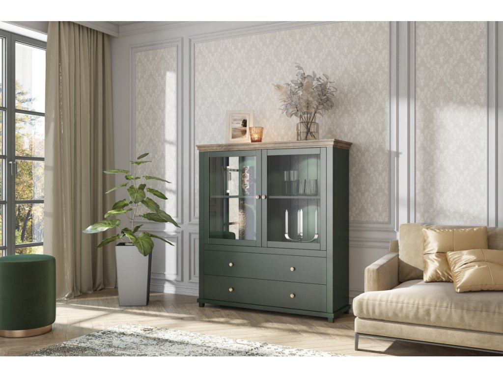 Korpus komody je vyroben z LTD desky, která se snadno udržuje. Přední části jsou vyrobeny z MDF desky, která je potažena kvalitní fólií. Tmavě zelená barva v kombinaci s imitací dřeva dub lefkas vytváří mimořádně stylové spojení barev. Malé úchyty, které jsou ve zlatém barevném provedení dodávají nábytku SABRILA elegantní charakter.