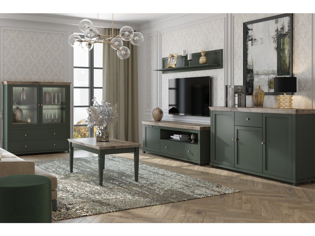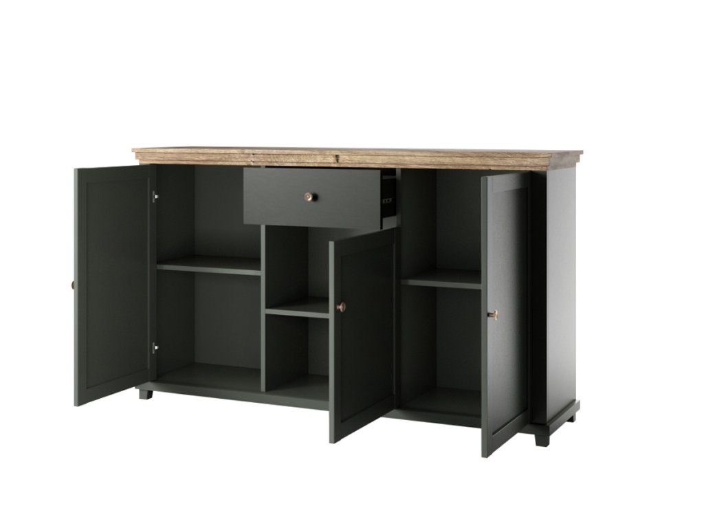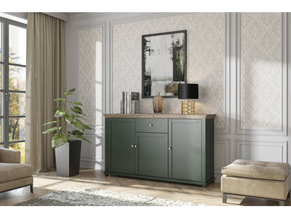 Korpus komody je vyroben z LTD desky, která se snadno udržuje. Přední části jsou vyrobeny z MDF desky, která je potažena kvalitní fólií. Tmavě zelená barva v kombinaci s imitací dřeva dub lefkas vytváří mimořádně stylové spojení barev. Malé úchyty, které jsou ve zlatém barevném provedení dodávají nábytku SABRILA elegantní charakter.