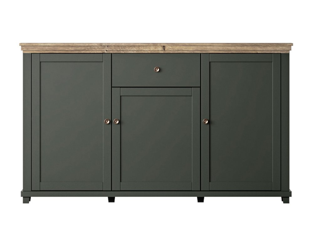 Korpus nábytku je vyroben z LTD desky, která se snadno udržuje. Přední části jsou vyrobeny z kvalitní MDF desky, která je potažena fólií. Tmavě zelená barva v kombinaci s imitací dřeva dub lefkas vytváří mimořádně stylové spojení barev. Malé úchyty ve zlatém barevném provedení dodávají nábytku elegantní charakter.