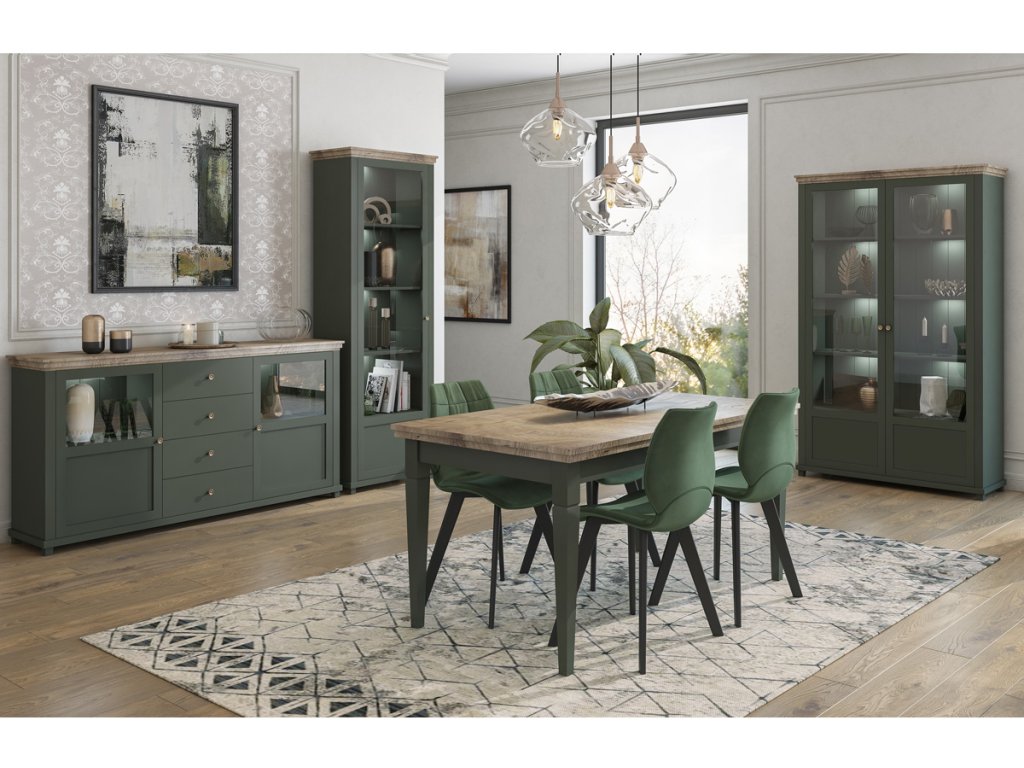 Korpus vitríny je vyroben z LTD desky, která se snadno udržuje. Přední části jsou vyrobeny z MDF desky, která je potažena kvalitní fólií. Tmavě zelená barva v kombinaci s imitací dřeva dub lefkas vytváří mimořádně stylové spojení barev. Malé úchyty, které jsou ve zlatém barevném provedení dodávají nábytku SABRILA elegantní charakter.
