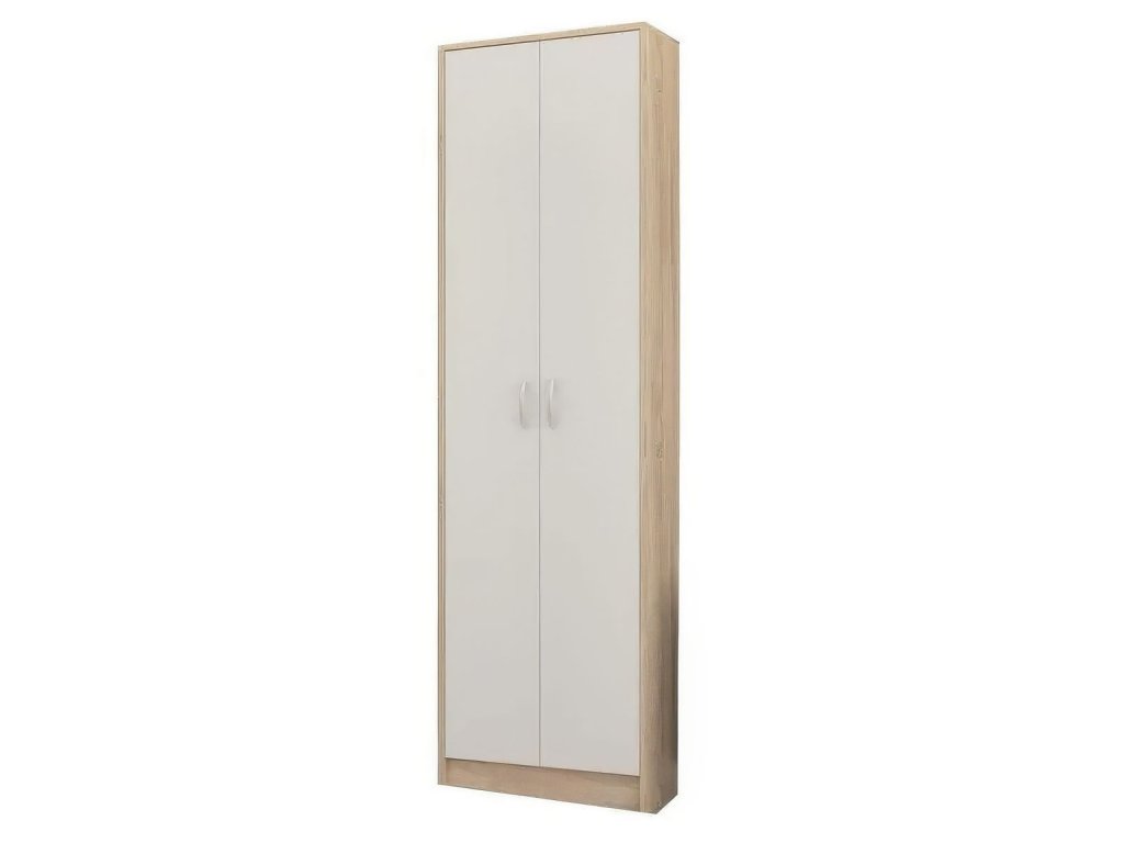 SAGITTA je dvoudveřová skříň v jednoduchém designovém provedení. Oceníte žádané barevné provedení, kombinaci barev i cenovou dostupnost. Tato malá skříň je ideálním nábytkem do vstupní haly. Díky jejím rozměrům si své místo najde iv jiné části bytu či domu. Skříň je vyrobena z lamino desky, která není náročná na údržbu. Uvnitř skříně se nacházejí 2 poličky a prostor pro věšení oblečení. Barva: dub sonoma/bílá. Rozměry (š/v/h): 55,3 x 191,1 x 27,5 cm. Ve stejném barevném a designovém provedení nabízíme také věšákovou sestavu. Zkombinujte si tyto dva produkty a vytvořte si stylovou a cenově dostupnou vstupní halu. Dodáváme v demontu.Doplňkové parametry