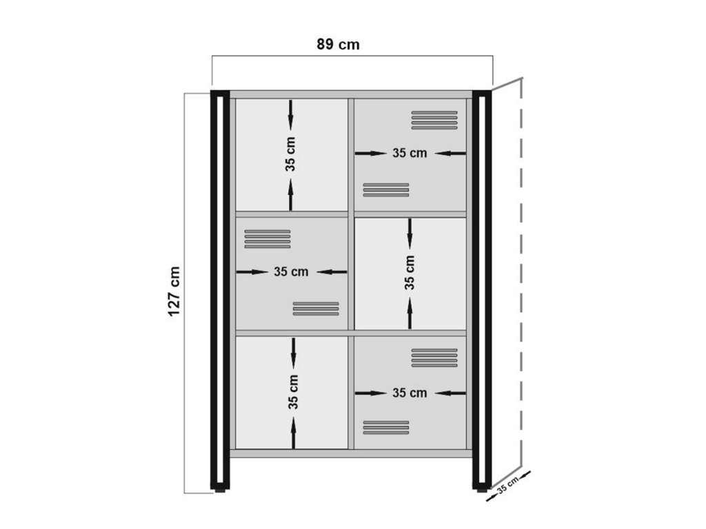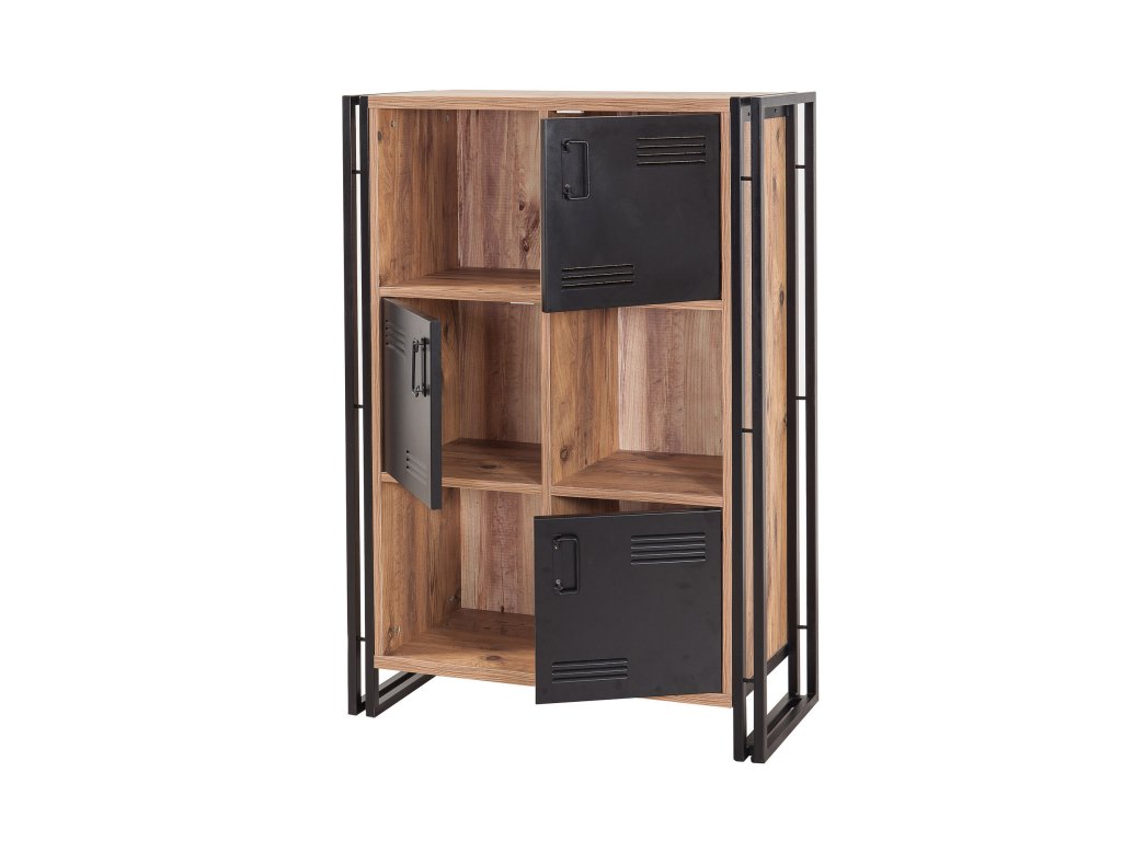 Knihovna SALLY je navržena tak, aby nabízela nejen úložný prostor, ale i stylový vzhled. Tři plná dvířka poskytují diskrétní místo pro uložení předmětů, zatímco tři otevřené police jsou ideální pro vystavení knih, dekorací nebo rostlin. Kovové úchytky dodávají knihovně moderní industriální charakter.