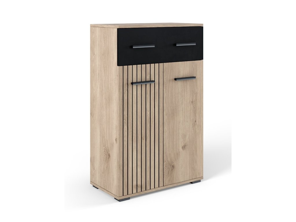 O stylový design Vaší vstupní části se postará moderní předsíňová sestava SAMBRE. Kombinace moderních barev a předních dvířek imitujících trendové lamely jí dodává jedinečný charakter. Za praktický rozměr sestavy jsou zodpovědné úložné prostory v podobě skříněk na boty a komody. Snadný přístup ke kabátům zabezpečují věšáky upevněné na věšákovém panelu.