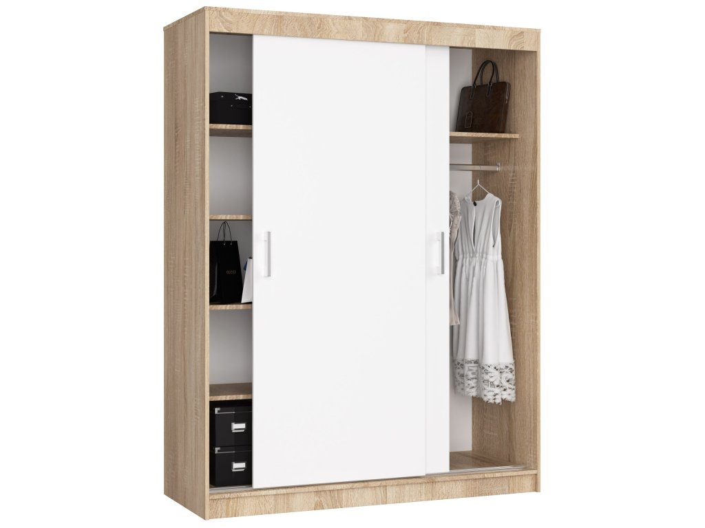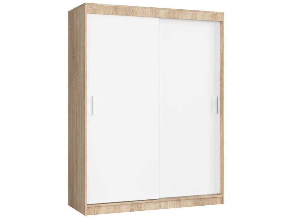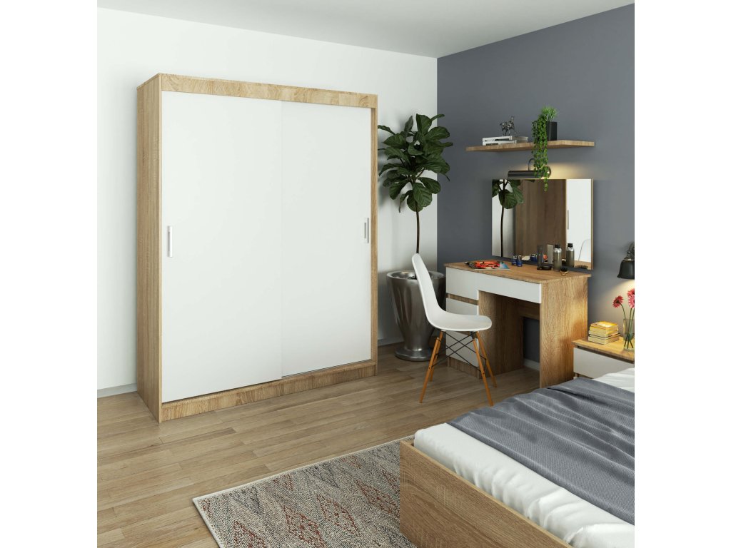 S šatní skříní AIRI150 v barvách dub Sonoma a bílá získáte stylové a praktické řešení pro vaši ložnici, které kombinuje nejlepší z moderního designu a klasické elegance.