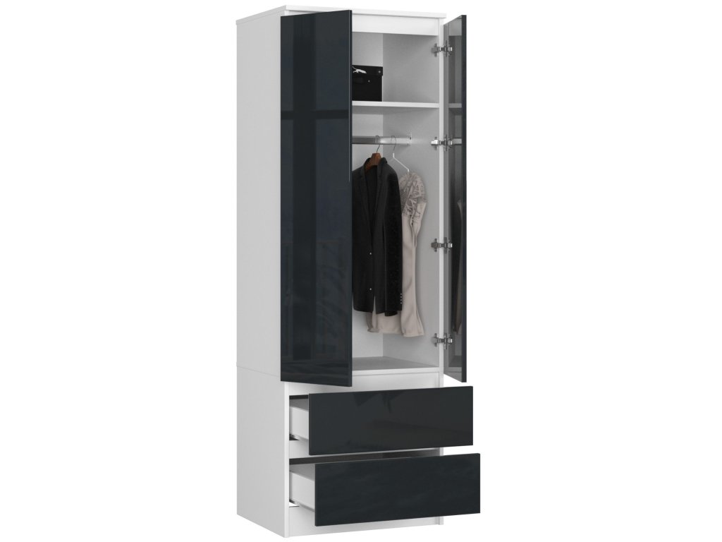 Vyrobeno z kvalitního MDF materiálu, AJA60 nabízí robustnost a dlouhou životnost. Kontrast bílé barvy a grafitového lesklého dekoru dodává skříni jedinečný a luxusní vzhled. Se svými rozměry 180 x 60 x 51 cm je ideální volbou pro většinu ložnic.