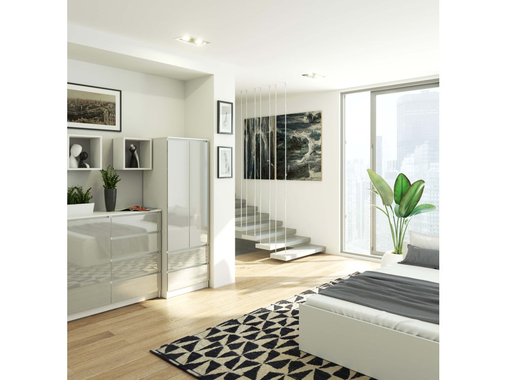 - Lesklý dekor: Metalický lesk na bílém pozadí vytváří skvostný kontrast a činí tuto skříň ideální volbou pro moderní interiéry.