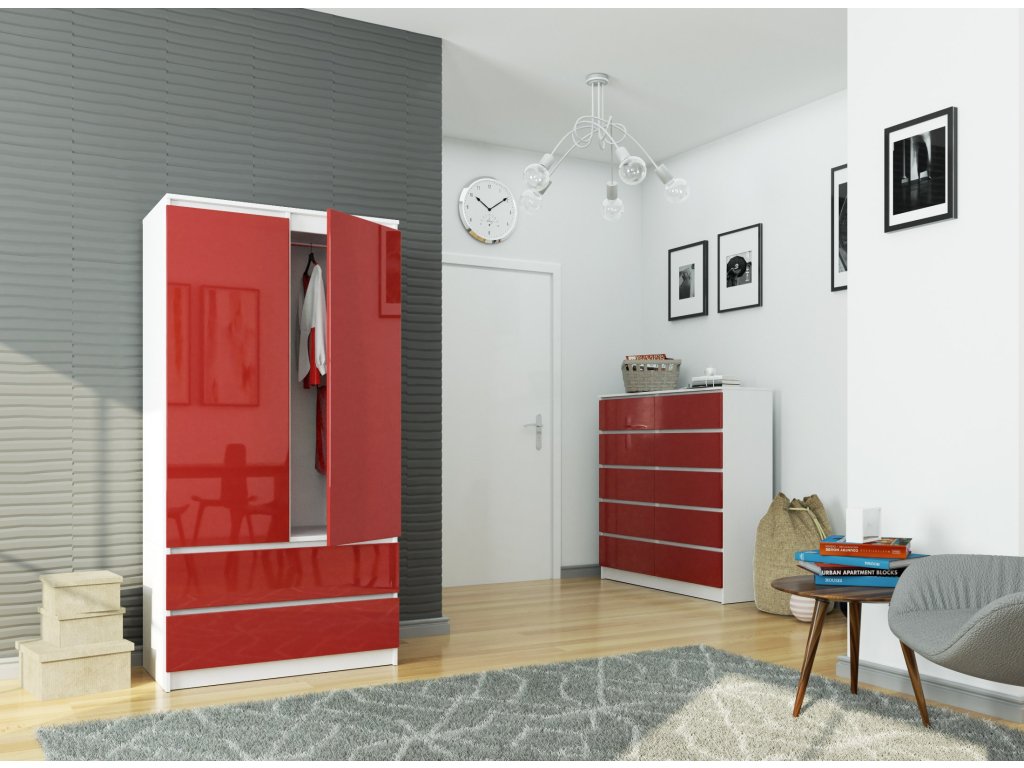 Představujeme vám ALEXI90, šatní skříň, která zaujme na první pohled díky své výrazné kombinaci bílé a červeného lesku. Tento kousek nábytku se stane centrálním bodem každé ložnice a dodá jí moderní vzhled.