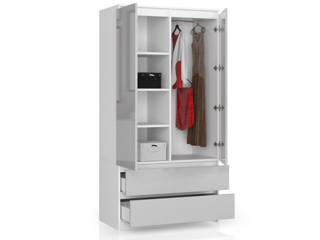 - Vybavení: Skříň nabízí dvě zásuvky a čtyři pohodlné police pro organizaci oblečení a doplňků.
