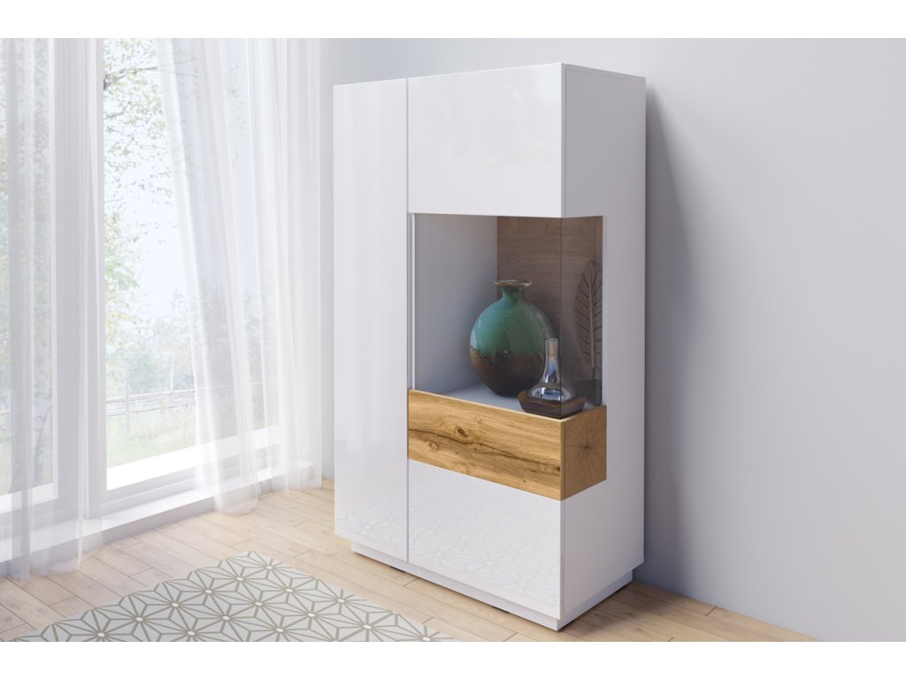 SILKE 44 - dvoudveřová vitrína, Jedny dveře jsou plné, druhé mají prosklenou část. Uvnitř se nacházejí 2 x 3 poličky. Provedení vitríny je pravé.
