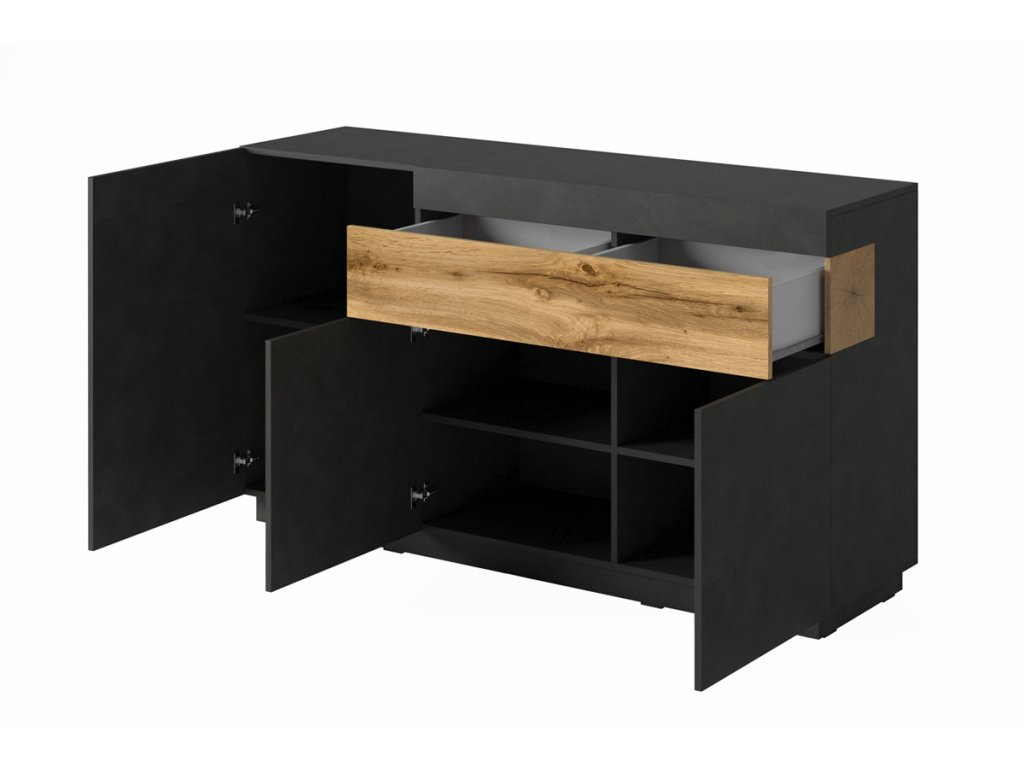 Komoda je kombinovaná - má dvířkovou i zásuvkovou část.