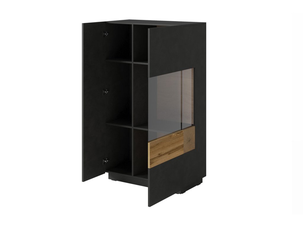 Vitrína je dvoudveřová. Jedny dveře jsou plné, druhé prosklené.