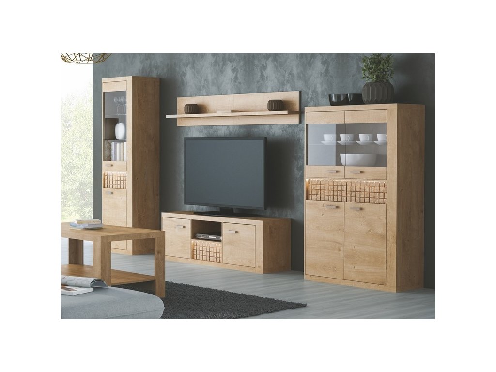 Obývací sestava. Jedná se o stylovou kolekci nábytku moderního stylu, který je vhodný do obývacího pokoje. Sestava se skládá ( šxhxv ) - vyšší vitrína ( 57 x 47,5 x 200,5 cm ), nižší vitrína ( 102 x 40,5 x 159,5 cm ), televizní stolek ( 150,5 x 40,5 x 51 cm ) a police ( 120 x 18 x 32 cm ). Barevné provedení dub ribbeck. Vsazením ozdobné kostičkované lišty je zvýrazněn rustikální vzhled masivního dřeva. Dvířka mají systém tichého dovírání. Zásuvky jsou opatřeny systémem PUSH TO OPEN ( zatlač a otevři ). Možnost dokoupit LED osvětlení. Jednotlivé díly lze zakoupit zvlášť. Dodáváme v demontovaném stavu.Doplňkové parametry