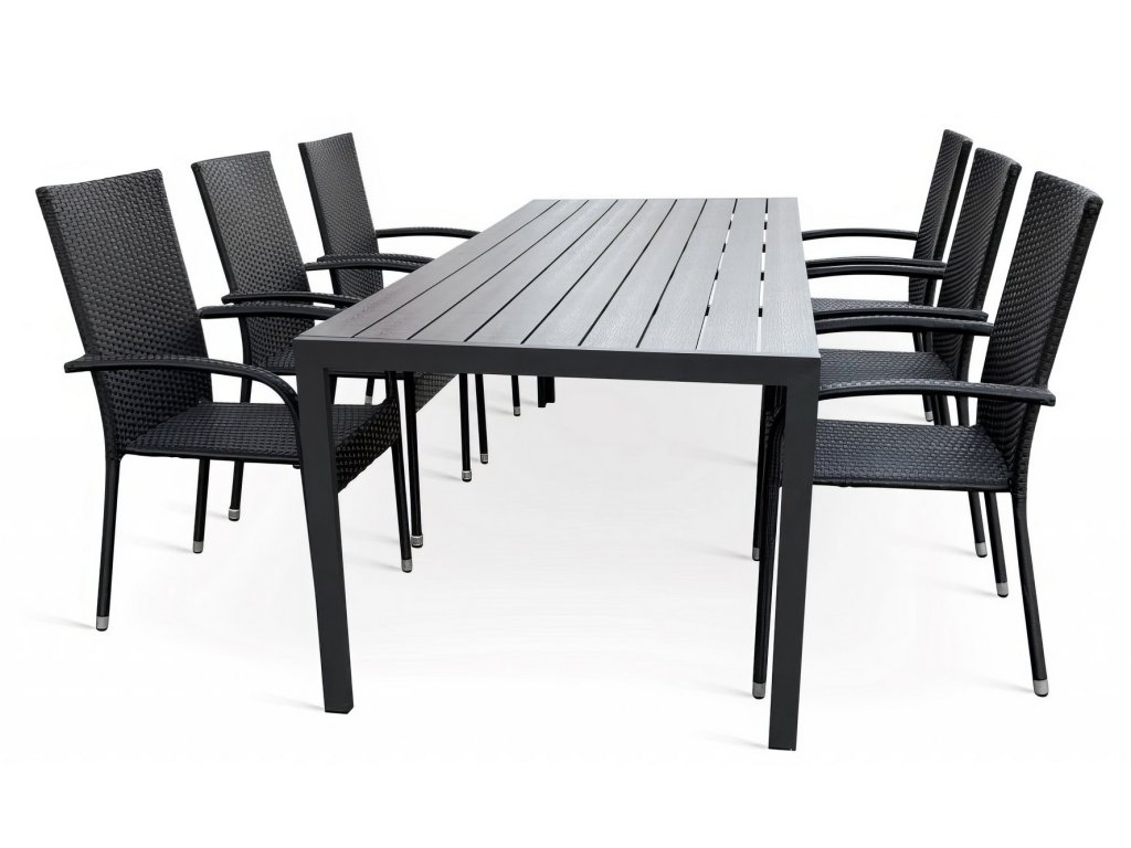 Zahradní sestava stůl NORIMBERK II + 6 ks ESSEN zahradní ratanové křeslo. Stůl s odolnou Artwoodovou deskou a hliníkovou konstrukcí a ratanových křesel. Díky použitým materiálům není údržba stolu nijak náročná, stůl je lehký a tím pádem se snadno přenáší. Nohy stolu jsou vybaveny adaptéry pro větší stabilitu. Rozměry nábytku š/v/h - stůl 90/74/205 cm a křeslo 56/94/64 cm, výška sedu je 43 cm. Barevné provedení - černá. Dodáváme v demontovaném stavu.