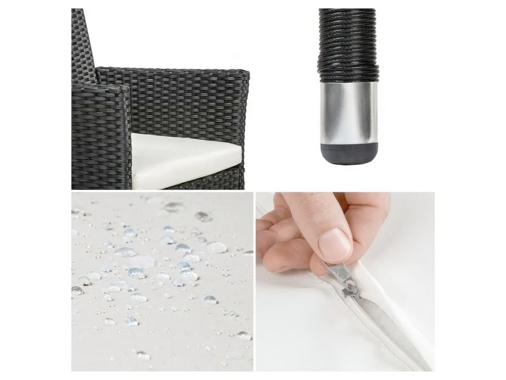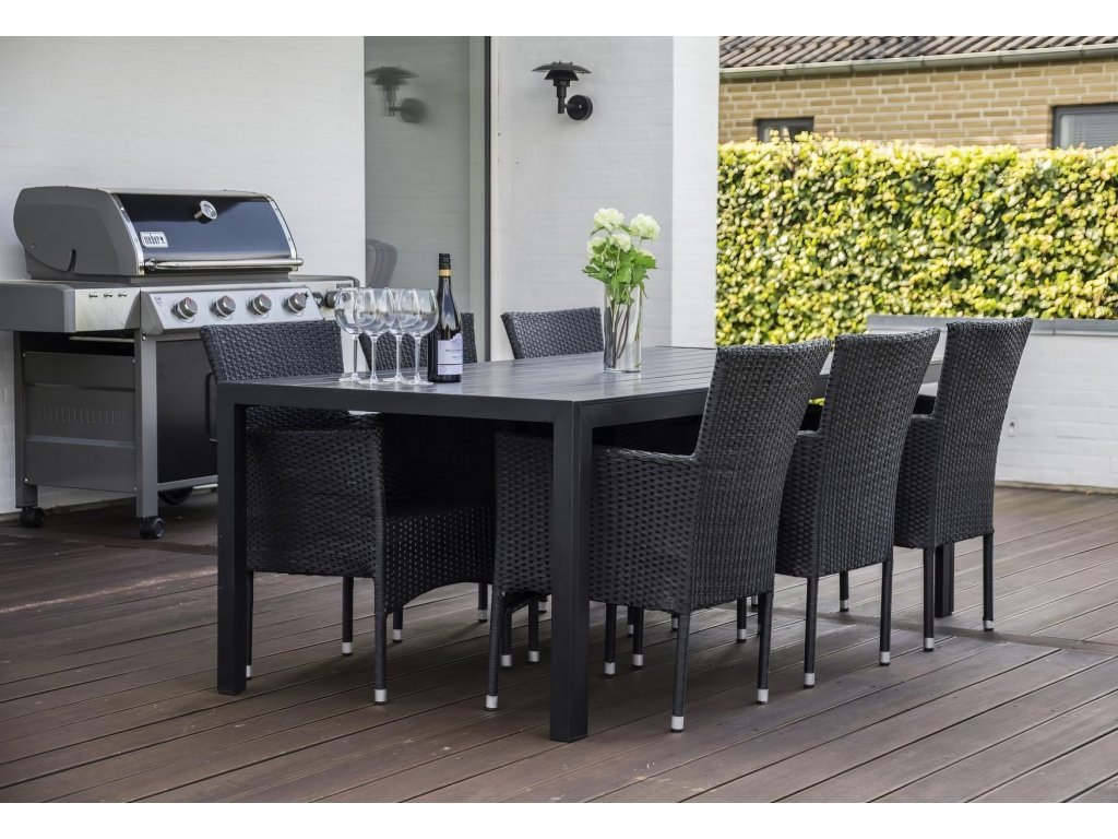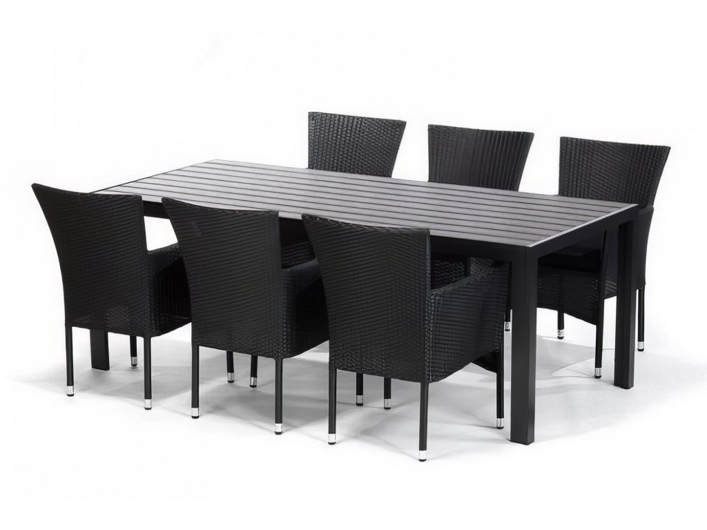 Zahradní sestava stolu NORIMBERK II + 6ks ratanového křesla HAMBURG. Stůl s odolnou Artwoodovou deskou a hliníkovou konstrukcí a ratanových křesel. Díky použitým materiálům není údržba stolu nijak náročná, stůl je lehký a tím pádem se snadno přenáší. Nohy stolu jsou vybaveny adaptéry pro větší stabilitu. Rozměry nábytku š/v/h - stůl 90/74/205 cm, křeslo 57/87/62 cm a výška sedu je 42 cm. Barevné provedení - černá. Jako bonus zdarma dodáváme včetně sedáku černé barvy, rozměr 46 x 47 x 3 cm (potah snímatelný pratelný). Dodáváme v demontovaném stavu.