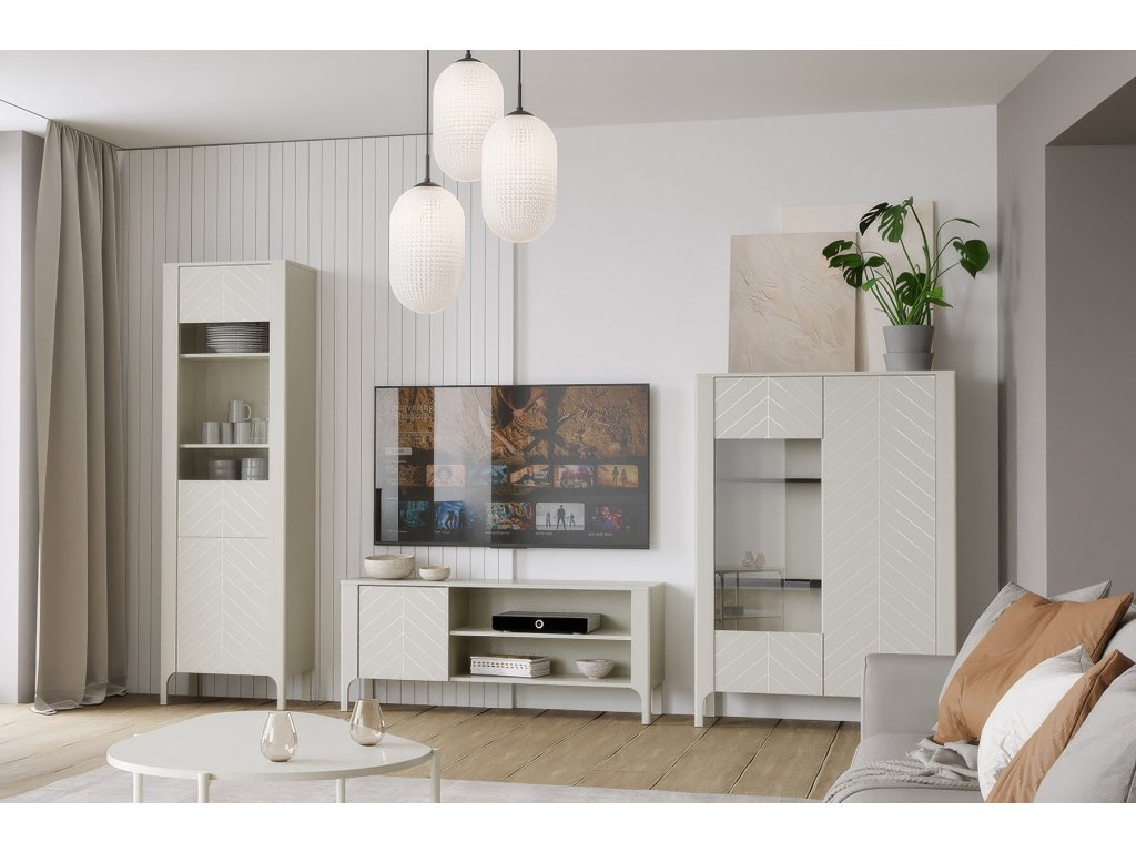Sestava se skládá - jednodvéřová vitrína, dvoudveřová vitrína a televizní stolek. Kvalitní výsuvy (soft close) a panty s tichým dovíráním se postarají o každodenní komfort.