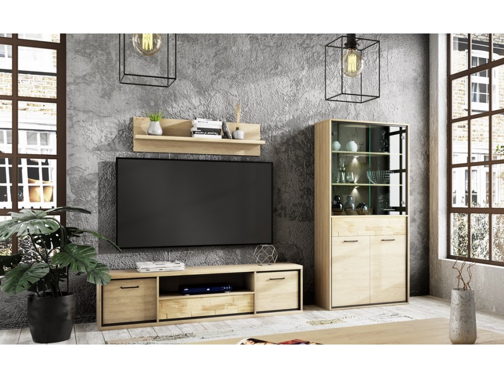 Obývací sestava v industriálním stylu v barevném provedení dub hickory, doplněno prvky v černé barvě. Nábytek je vyroben z kvalitního lamina ohraničeného ABS páskou a také je vybaven systémem tichého dovírání. Sestava se skládá z těchto prvků (Š x V x H cm) - vitrína (92,2 x 197 x 41 cm), závěsná police (120 x 32 x 18 cm) a televizní stolek (181 x 47,5 x 41 cm). Zásuvka je doplněna dekorační dubovou deskou a systémem push to open - otvírání zmáčknutím zásuvky. Úchyty jsou černé kovové. Dále je možné dokoupit LED osvětlení vitríny a také LED dekorační pásek. Kolekce se skládá z mnoha prvků a tento široký výběr Vám zaručí sestavit si nábytek podle svých vlastních představ a přání. Dodáváme v demontovaném stavu.Doplňkové parametry