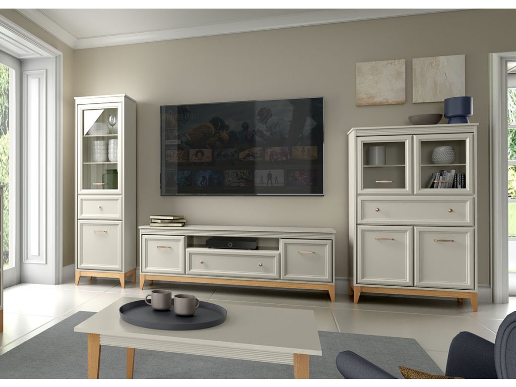 Sestava se skládá - jednodvéřová vitrína, dvoudveřová vitrína a televizní stolek. Kvalitní výsuvy (soft close) a panty s tichým dovíráním se postarají o každodenní komfort. Rozměry viz obrázky.