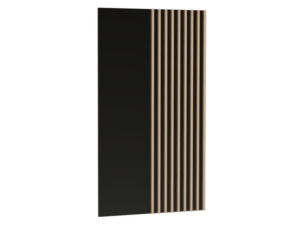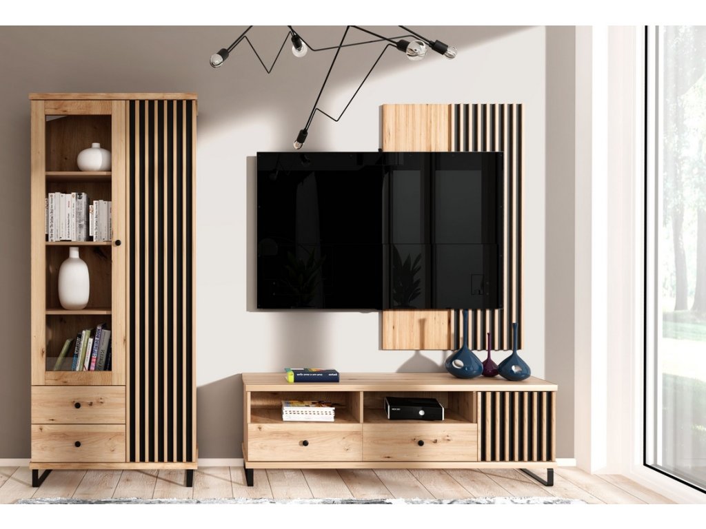 Obývací sestava s netradičním provedením detailu dvířek s lamelami. Kolekce nábytku v sobě spojuje jednoduchost, originální vzhled a funkčnost. Barevné provedení je v kombinaci dub artisan/černá mat. Sestava se skládá z těchto položek (Š x V x H cm) - vitrína dvoudveřová se zásuvkami (86,4 x 201 x 40,6 cm), televizní stolek (160,6 x 53,4 x 40,6 cm a závěsný panel (80 x 148 x 3,2 cm). Nábytek je vyroben z kvalitního lamina ohraničeného ABS páskou, dekorační lamely jsou vyrobeny z desky MDF. Zásuvky jsou vybaveny kovovými pojezdy se systémem tichého dovírání. Sestava je doplněna kovovými nohami v černé barvě. Kolekce se skládá z mnoha prvků a tento široký výběr Vám zaručí sestavit si nábytek podle svých vlastních představ a přání. Možnost dokoupení LED osvětlení. Dodáváme v demontovaném stavu.Doplňkové parametry
