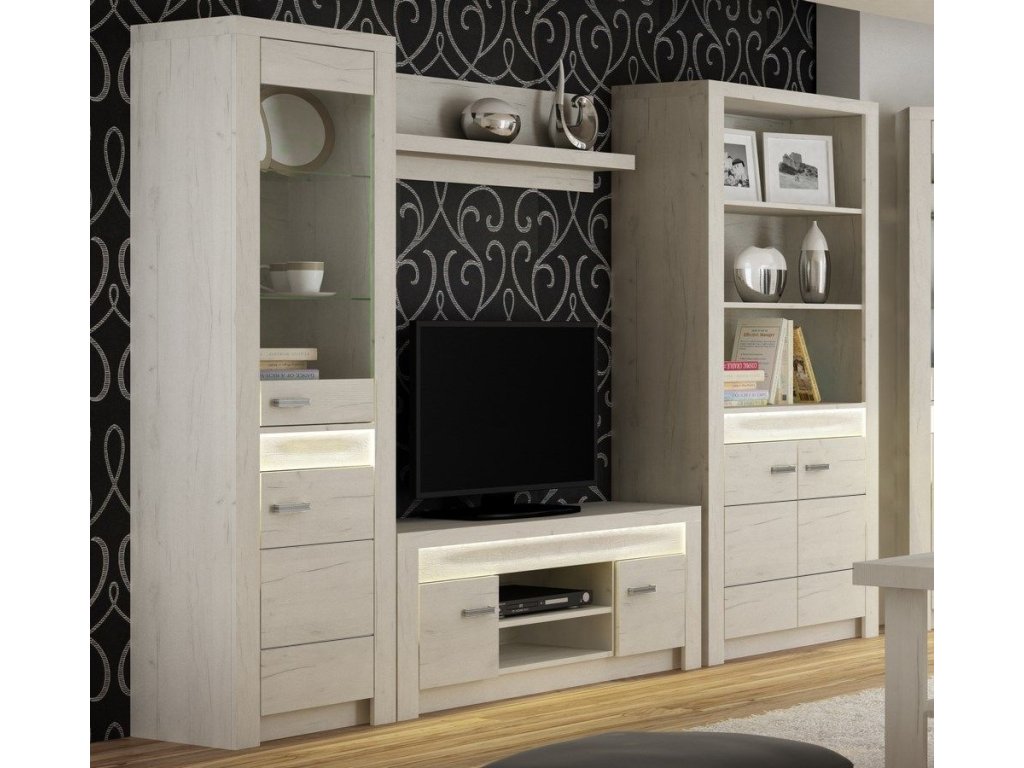 Obývací sestava. Systém je exkluzivní kolekce navržena v moderním duchu. Celá řada se vyznačuje elegancí a jednoduchými tvary, které zaručují plné využití prostoru. Nábytek je vyroben z kvalitního lamina s ABS hrany ( 0,5-0,8 mm ), úchyty jsou z kovu. Barevné provedení je jasan bílý indiana. Sestava se skládá ( šxhxv ) - vitrína ( 56 x 42 x 192 cm ), regál ( 96 x 42 x 192 cm ), tv stolek ( 137 x 42 x 53 cm ) a police ( 120 x 18 x 32 cm ). Nábytek neobsahuje LED osvětlení v ceně, možnost dokoupení. V naší nabídce naleznete další sortiment z řady. Dodáváme v demontovaném stavu.Doplňkové parametry