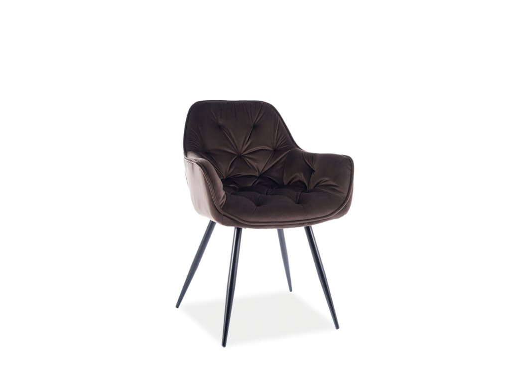 Designová židle je vhodná do interiérů zařízených ve vintage či skandinávském stylu. Konstrukce židle je kovová v černé barvě, sedák s opěrkou jsou očalouněny hnědou sametovou látkou příjemnou na dotek. Židle je v nabídce iv dalších provedeních.