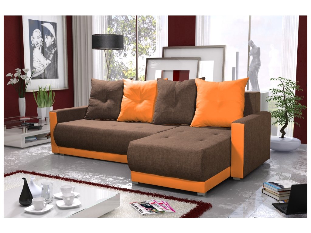 Rohová sedačka SIGNIA patří k menším sedačkám. Moderní design se pojí s efektním polštářovým provedením opěrek a jemným prošitím na sedací části. Rovné linie sedačky jsou propojeny s dvoubarevným provedením, což znásobí unikátnost tohoto nábytku. K sedačce patří také nenápadné malé nožičky (2 cm). Umístění rohu je univerzální (levé i pravé) a můžete si jej zvolit přímo při skládání ve vašem pokoji. Sedačka má funkci rozkladu a nabízí spací plochu o rozměrech 133 x 200 cm. Sedací souprava má pevnou konstrukci, vyrobenou v kombinaci dřeva a LTD desky. Sedací část je vyrobena v kombinaci zvlněné pružiny a pěny T 30. Součástí sedačky jsou 4 polštáře s uzavíráním na zip. Sedačka je čalouněna v látce Savana 25 (hnědá barva) a Savana 18 (oranžová barva) . V nabídce máme i další zajímavá a výrazná barevná provedení. Celkový rozměr sedačky je 240 x 144 cm. Výška sezení je 37 cm, výška opěradla je 68 cm. Hloubka sedu je 67 cm.Doplňkové parametry