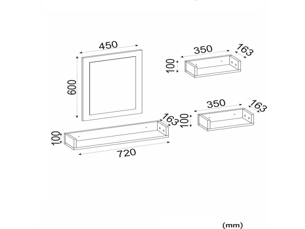 Rozměry : šířka nejširší police 72 cm, výška zrcadla 60 cm (další rozměry v nákresu)