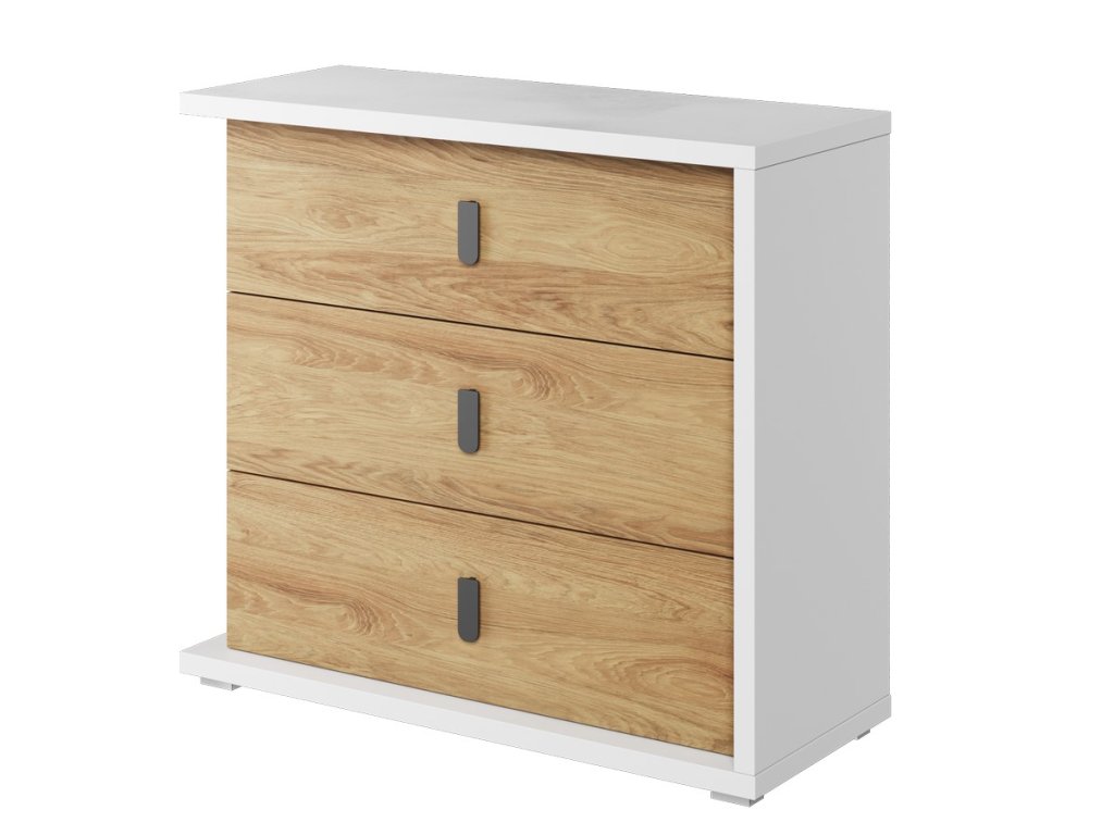 Komoda se třemi zásuvkami v jemném přírodním stylu. Korpus je vyroben z desky LTD v barvě bílá, dvířka jsou vyrobeny z desky LTD v barvě ořech natural. Dodáváme v demontovaném stavu.Doplňkové parametry
