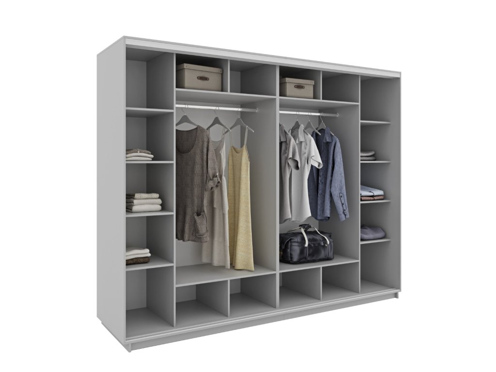Šatní skříň má netypickou výšku, až 220 cm, čímž se zajistí větší úložný prostor. Skříň je členěna na policovou a závěsnou část se dvěma závěsnými tyčemi.
