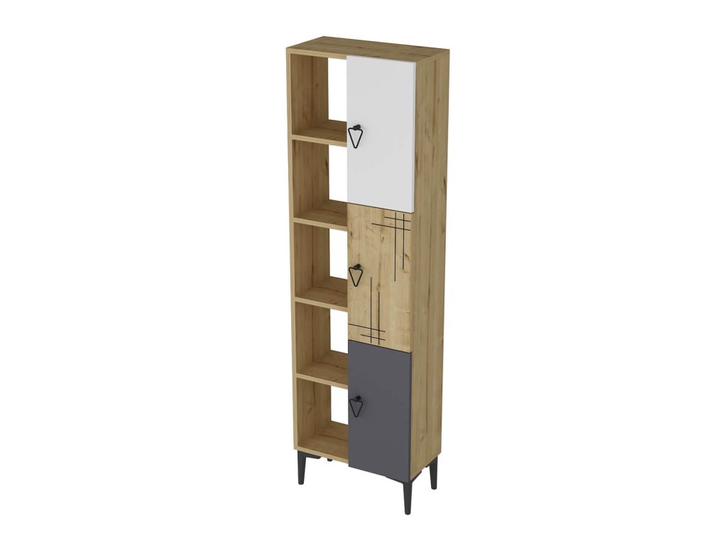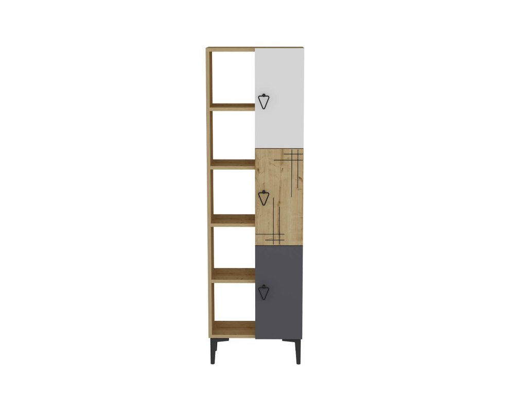 Knihovna SIRI je dokonalým spojením funkčnosti a moderního designu. Je ideální pro obývací pokoj, kde nabídne dostatek úložného prostoru díky třem plným dvířkům a čtyřem policím. Její kombinace barev a čisté linie dodají vašemu interiéru elegantní a moderní vzhled.