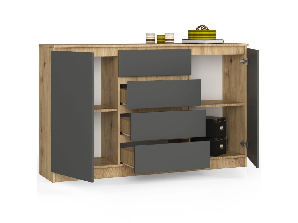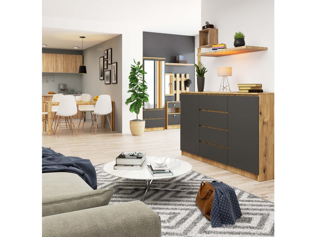 SOPHIA160 představuje kombinaci tradičního dubu artisan s moderní šedou, což vytváří nábytek, který oživí jak ložnici, tak obývací pokoj. Tato široká a vysoká komoda je nejen stylová, ale také nabízí spoustu úložného prostoru pro vaše potřeby.