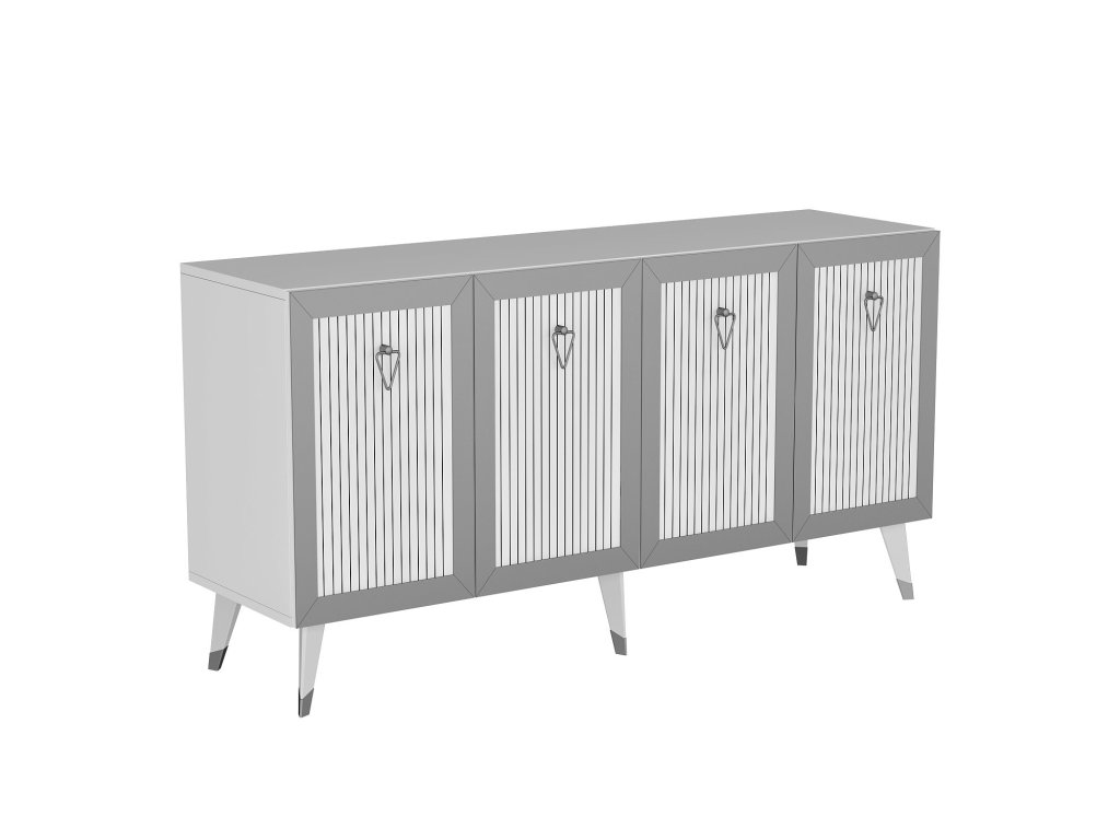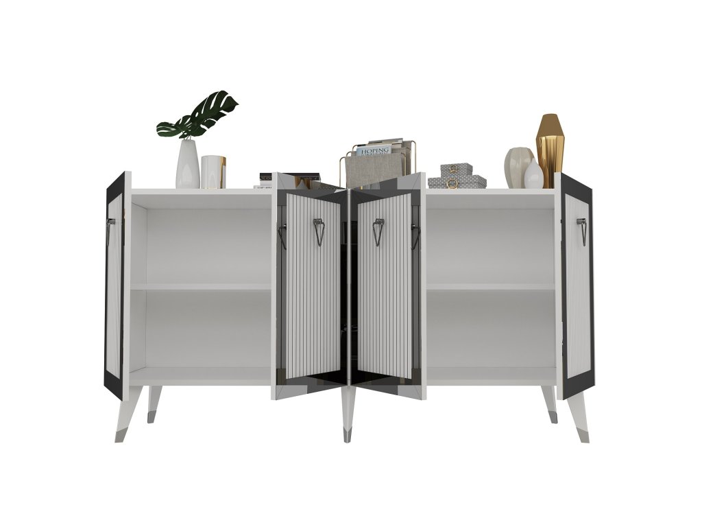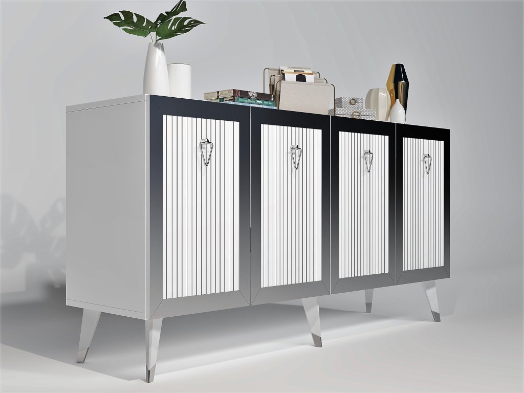 Ponořte se do světa luxusu a stylu s naší komodou. Její konstrukce ze 100% melaminově potažené dřevotřísky zajišťuje odolnost a dlouhou životnost, zatímco tloušťka 18 mm dodává nádech robustnosti. Kombinace bílé a stříbrné barvy vytváří výrazný kontrast, který okamžitě upoutá pozornost vašich hostů.