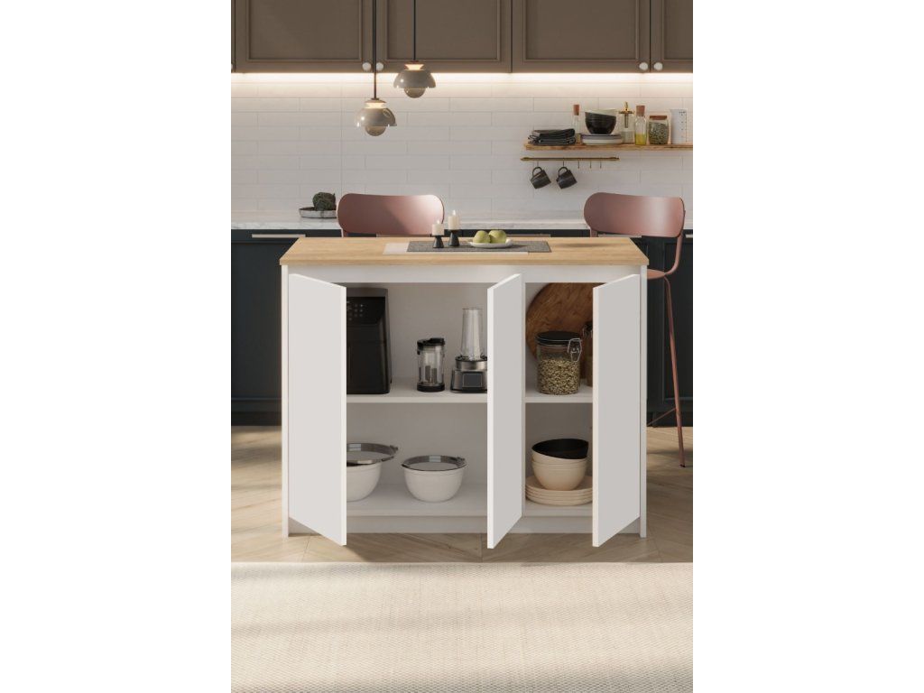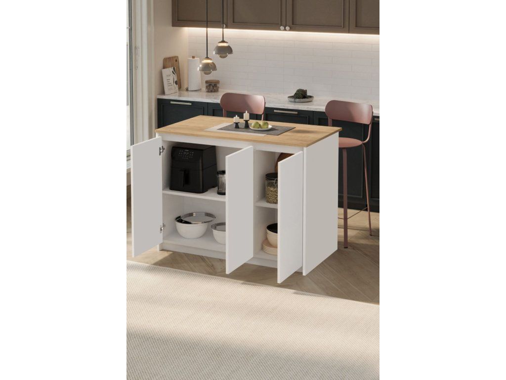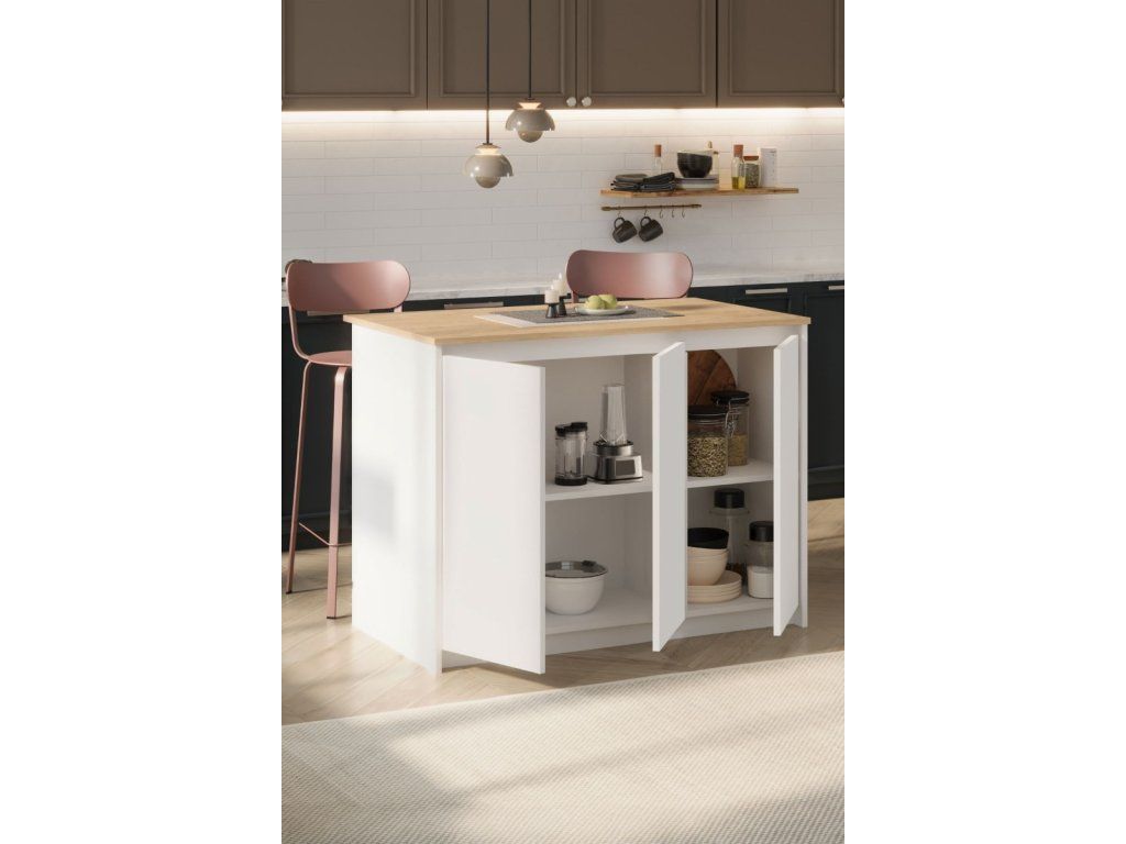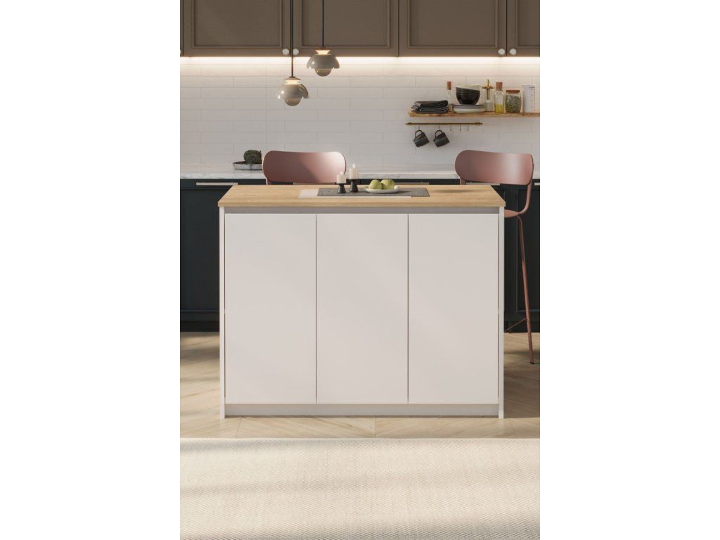 Kuchyňský ostrůvek SOFIS je ideálním řešením pro rozšíření pracovního prostoru i úložných možností ve vaší kuchyni. Díky svému modernímu designu v kombinaci bílé barvy a přírodního dekoru dřeva se snadno sladí s různými styly interiéru.