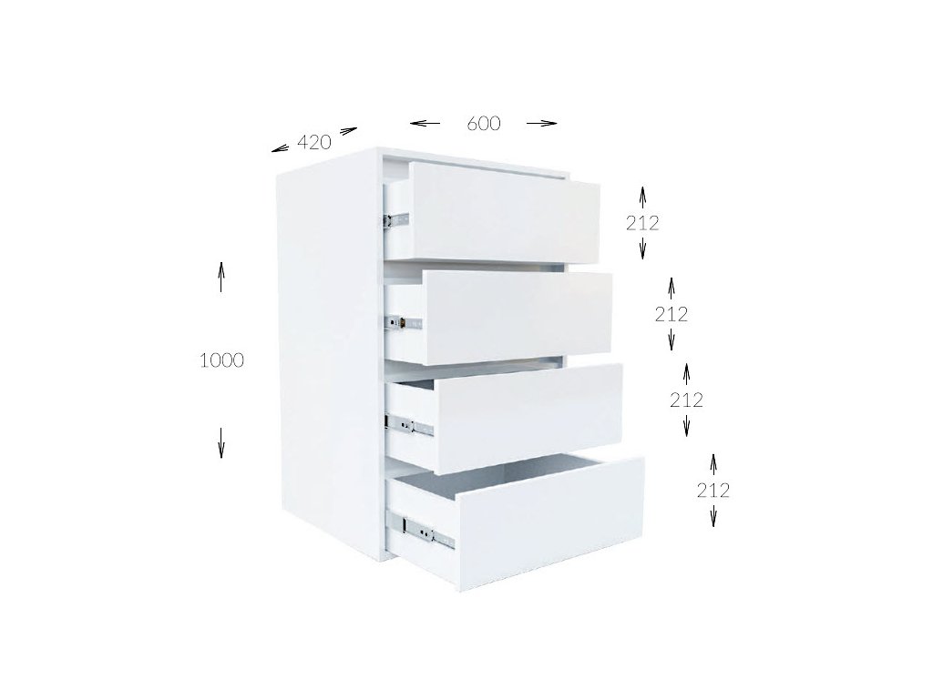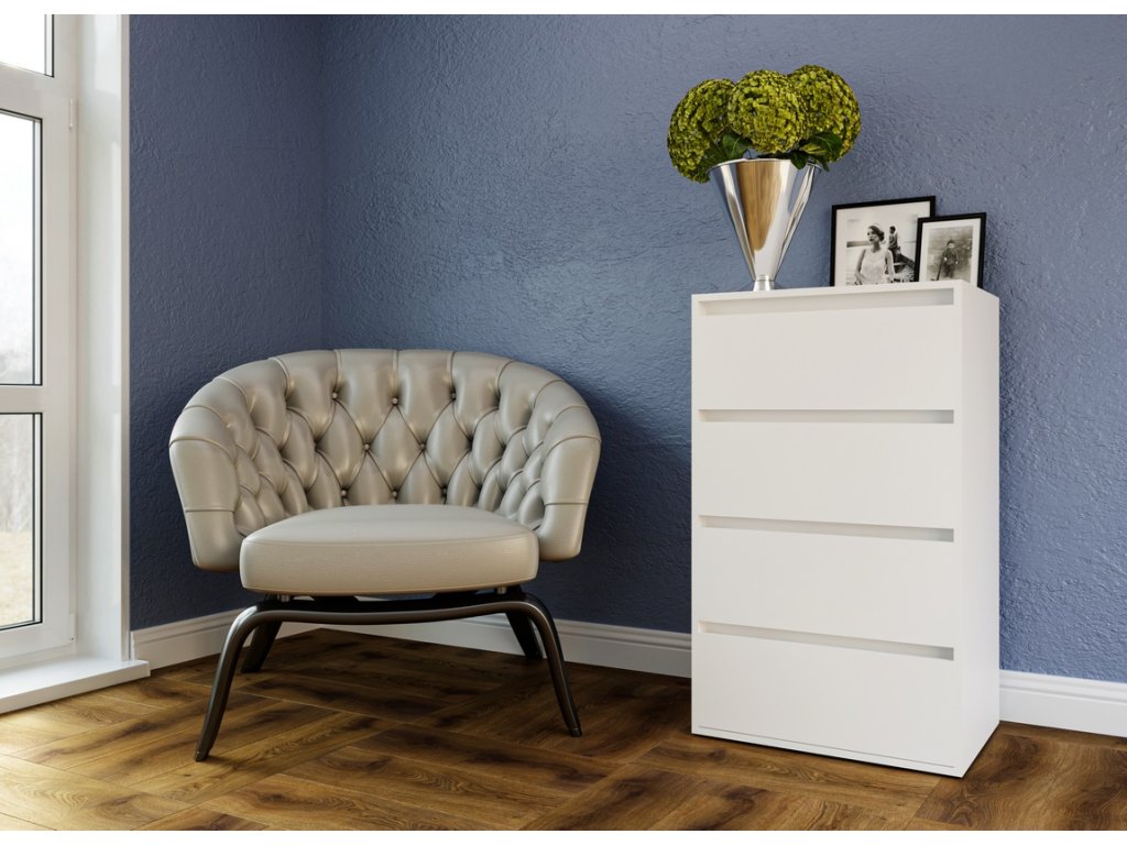 Bílá komoda SONIJA se čtyřmi zásuvkami se hodí do každého interiéru. Díky svým praktickým rozměrům se vejde i do menších prostorů, přičemž poskytuje dostatek úložného prostoru. Díky nadčasovému bílému provedení se velice snadno kombinuje s jakýmkoli nábytkem. Potěší nejen svou elegancí, ale také mimořádně příznivou cenou.