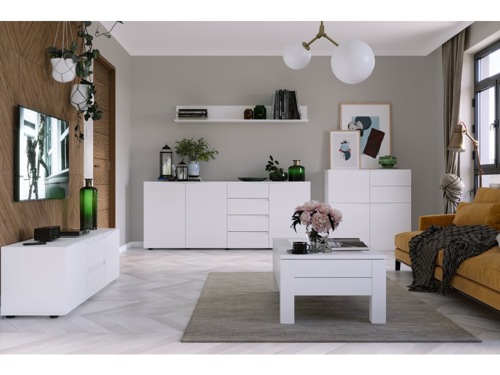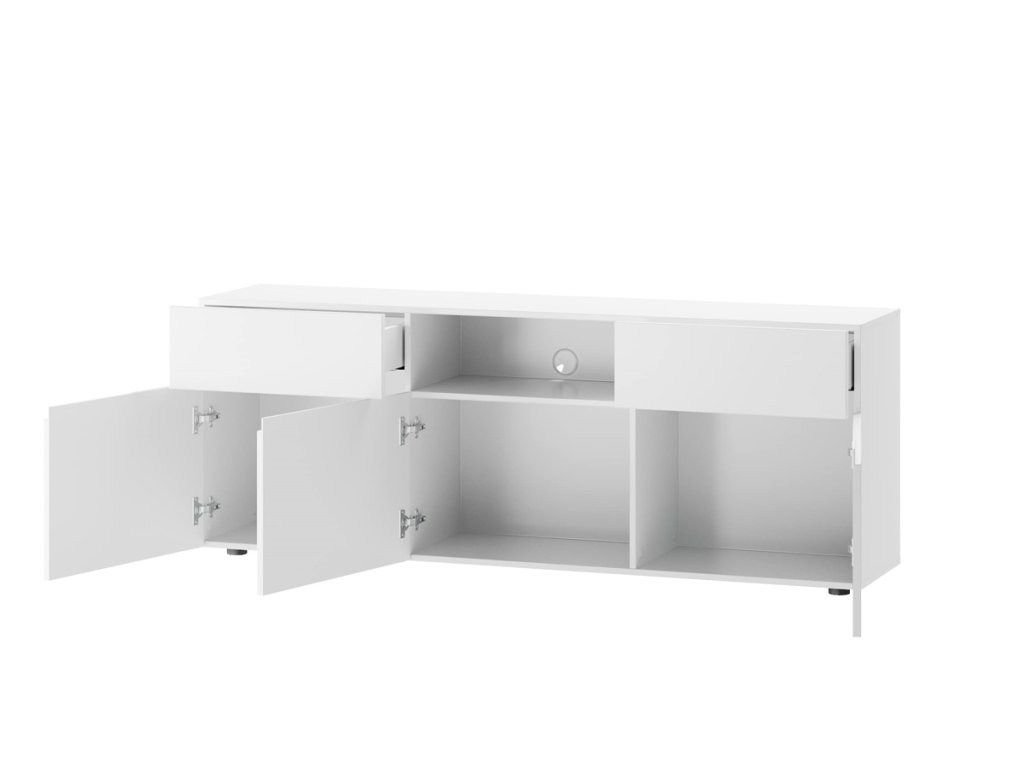 Televizní stolek STAND je jedním z prvků atraktivního nábytku STAND. Zaujme vás svým designem a funkčností. Je vyroben z MDF desek. Ty jsou pokryty matnou fólií v moderní bílé barvě. TV stolek je třídveřový. Uvnitř má praktický úložný prostor. Disponuje také dvěma zásuvkami a jednou otevřenou poličkou. TV stolek je bez úchytů. Rozměry (š,v,h): 165 x 62 x 38 cm. Nábytek STAND je v moderním a minimalistickém provedení. Díky své univerzálnosti jej můžete použít do různých místností vašeho domu. Výborně se hodí do předsíně, obývacího pokoje nebo jídelny. Záleží jen na vás a vaší fantazii, kde tento nábytek použijete. Jasné barvy nábytku STAND rozsvítí a zútulní interiér. Díky němu se budete cítit u vás doma skvěle. Dodáváme v demontovaném stavu.Doplňkové parametry