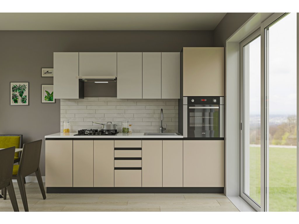 Kuchyňské skříňky jsou vyrobeny z kvalitních LTD desek. Jejich údržba je nenáročná. Korpus je v barvě grafitu. Dvířka jsou v v barvě nymfea alba, satin. Mají integrované úchyty typu GOLA.