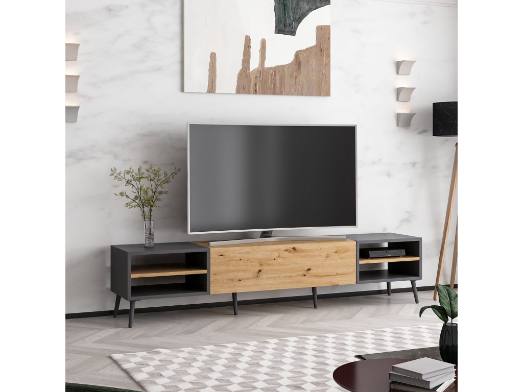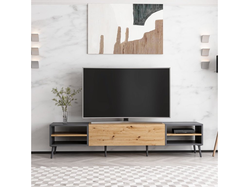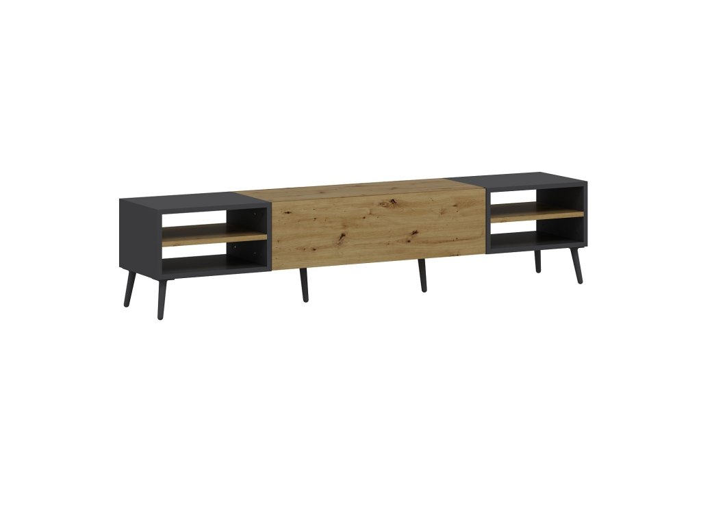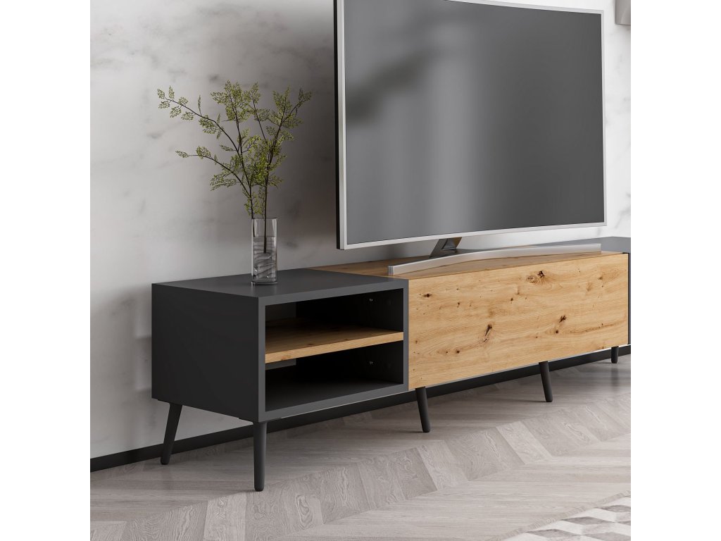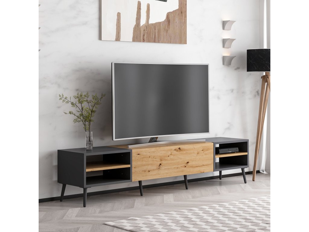 TV stolek STREAM přináší elegantní kombinaci moderního designu a praktického využití. Díky jednomu plnému dvířku a regálku nabízí dostatek úložného prostoru pro elektroniku, kabely a další doplňky. Stylová barevná kombinace dubu Artisan a antracitu dodává stolku jedinečný vzhled, který se hodí do každého obývacího pokoje.
