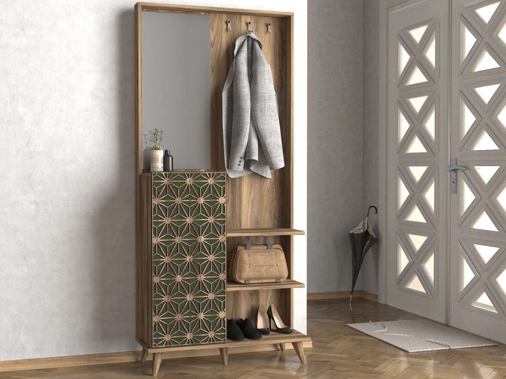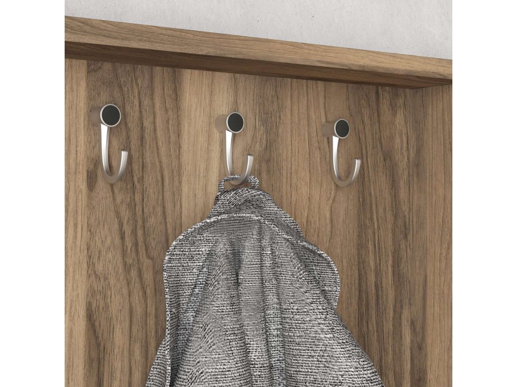 Předsíňová sestava STRESS nabízí kombinaci skříní, šatníku, věšáků a velkého zrcadla, což zajišťuje dostatek úložného prostoru pro všechny vaše potřeby. Vyrobena z kvalitních materiálů LTD a skla s tloušťkou 18 mm, zaručuje dlouhou životnost a odolnost. Barva ořechu a orientální design dodávají sestavě jedinečný a luxusní vzhled, který se snadno stane ústředním bodem vaší předsíně.