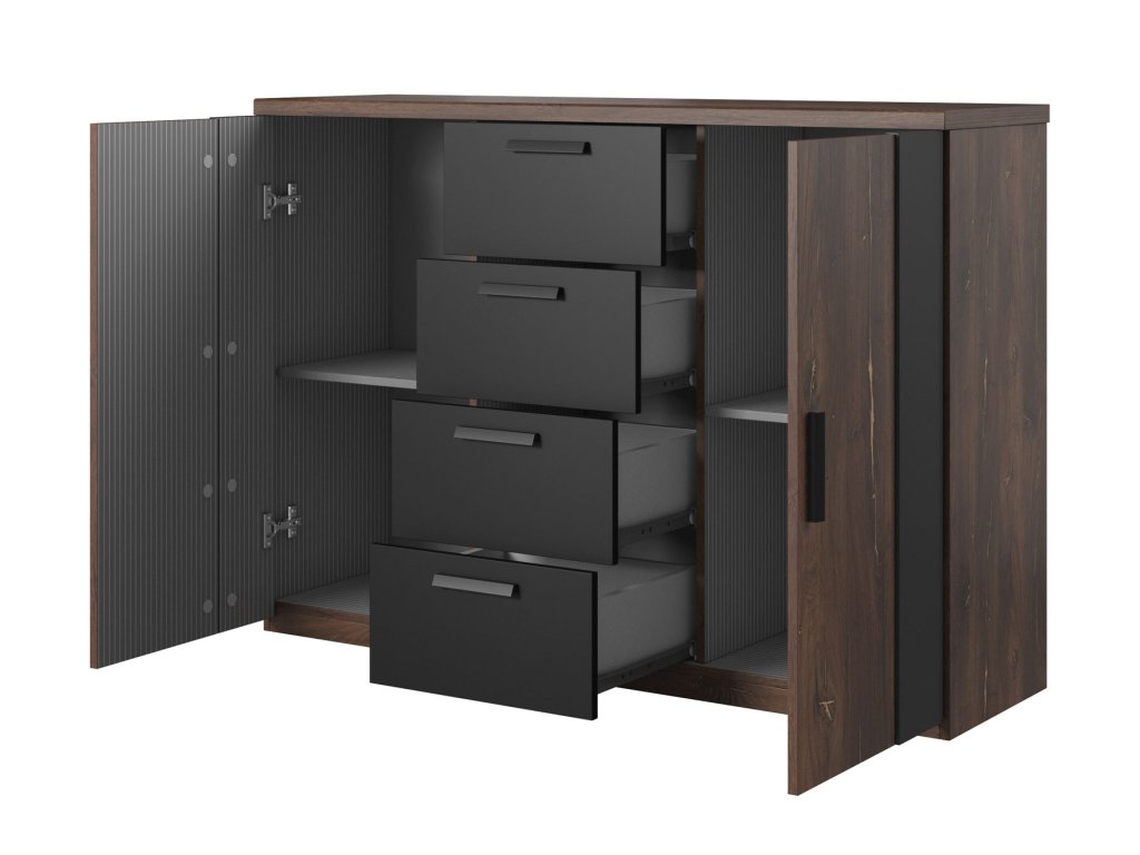 Komoda SYNONYM 26 má po stranách dvířka za kterými jsou praktické police a ve středu čtyři zásuvky.