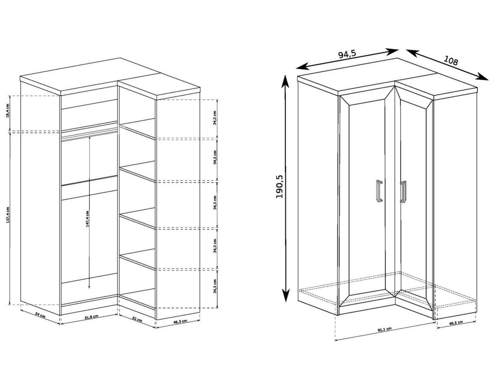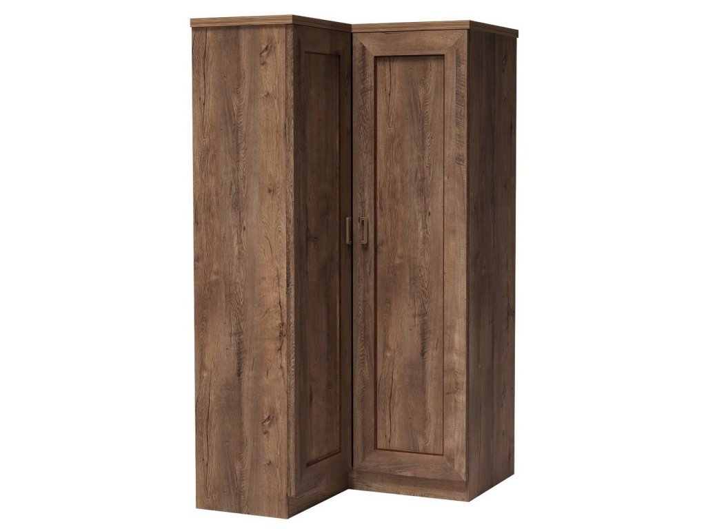 Rohová šatní skříň pravá ze sektorové řady. Vlevo se nachází police a volný prostor se šatní tyčí, vpravo jsou 4 police. Možnost objednání opačné verze. Systém je exkluzivní kolekce navržena v duchu vintage. Celá řada se vyznačuje elegancí a jednoduchými tvary, které zaručují plné využití prostoru. Nábytek je vyroben z velmi kvalitní LTD o tloušťce 16 mm, horní deska zesílena na 32 mm, lišty na čele nábytku jsou MDF, hrany ABS. Tvrzené sklo ve vitrínách je jemně zdobené. Elegantní úchyty jsou z kovu. Barevné provedení dub lefkas. Dodáváme v demontovaném stavu.Doplňkové parametry