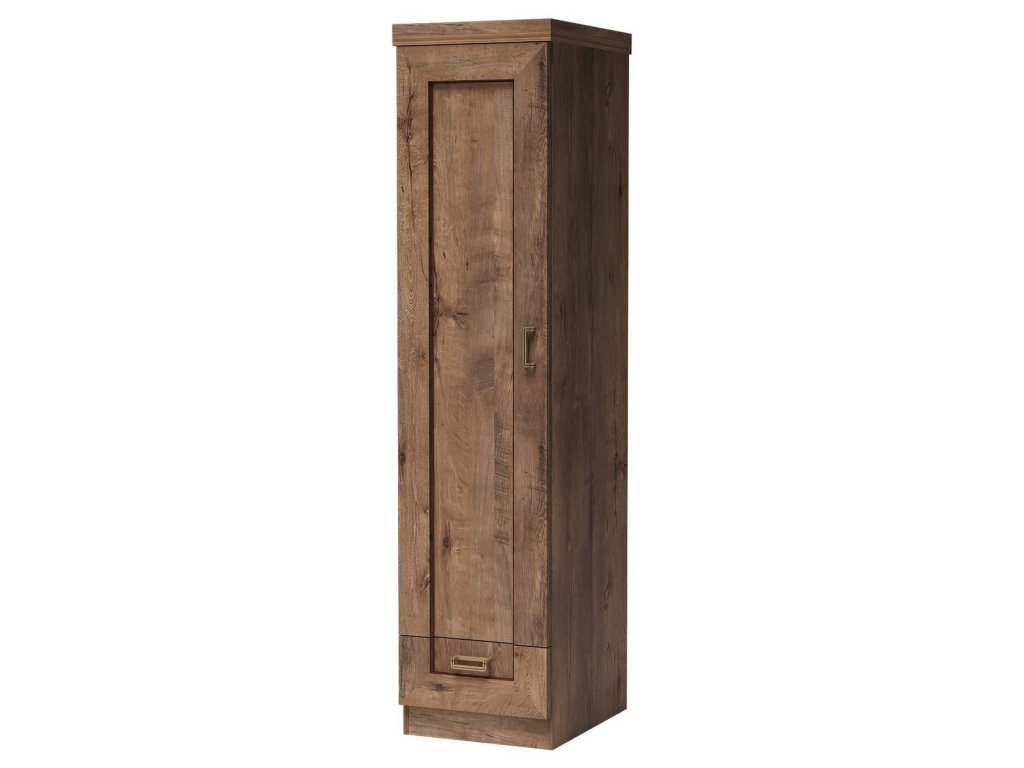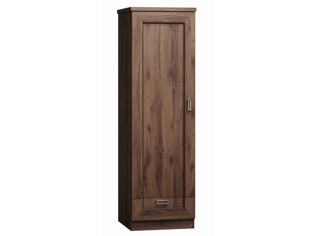 Skříň jednodveřová s 1 zásuvkou levá ze sektorové řady. Skříň má 1 dveře a 1 praktickou zásuvku, uvnitř je volný prostor se šatní tyčí. Systém je exkluzivní kolekce navržena v duchu vintage. Celá řada se vyznačuje elegancí a jednoduchými tvary, které zaručují plné využití prostoru. Nábytek je vyroben z velmi kvalitní LTD o tloušťce 16 mm, horní deska zesílena na 32 mm, lišty na čele nábytku jsou MDF, hrany ABS. Tvrzené sklo ve vitrínách je jemně zdobené. Elegantní úchyty jsou z kovu. Barevné provedení dub lefkas. Dodáváme v demontovaném stavu.Doplňkové parametry