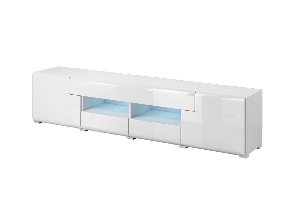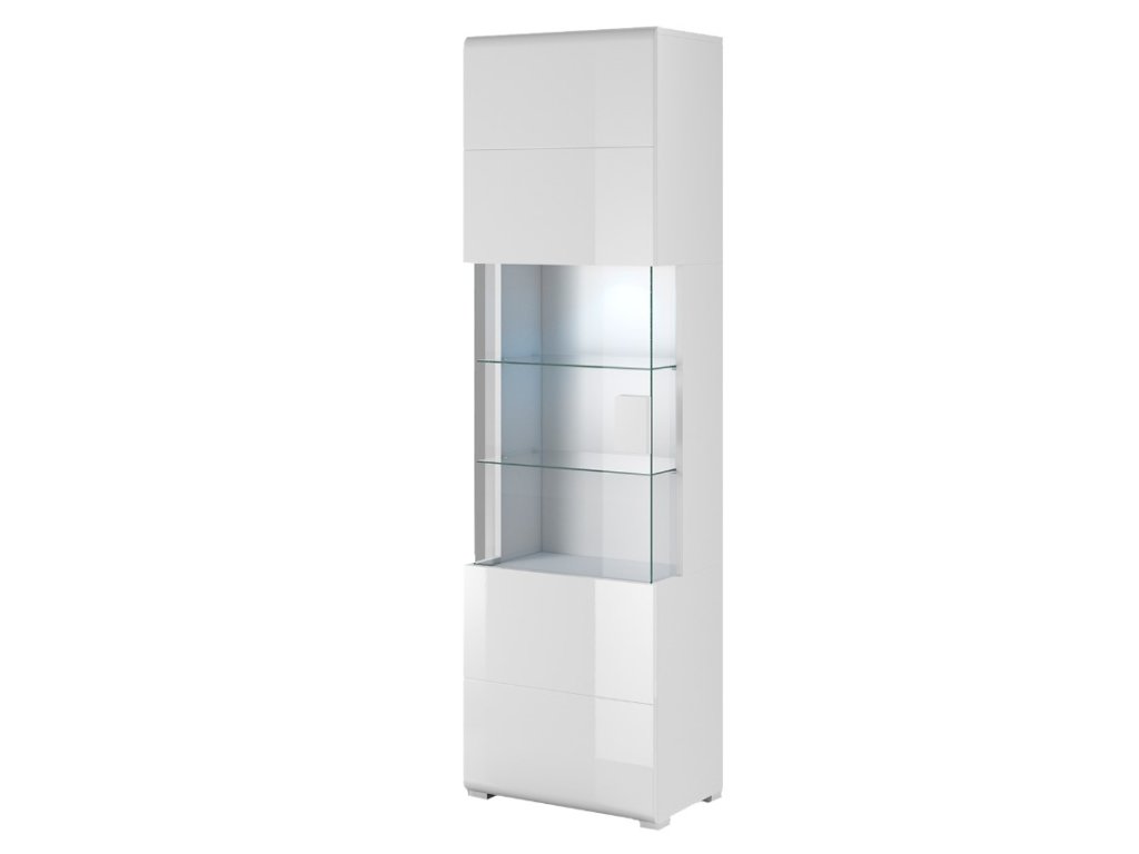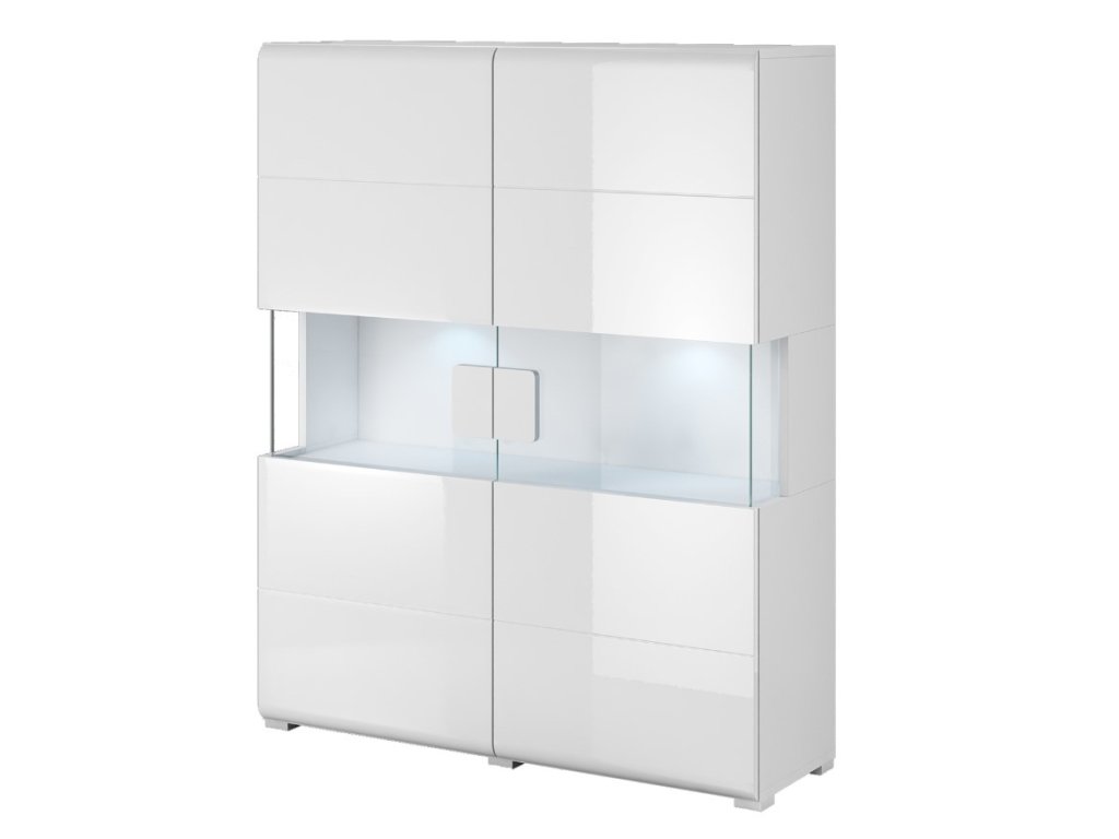 Dvířka nábytku jsou v barvě bílý lesk. Přední části dvířek jsou potaženy membránovou fólií, která nábytku poskytuje dlouhou životnost. Skleněné části nábytku jsou z tvrzeného skla a zaručují bezpečnost při používání. K nábytku lze dokoupit diskrétní LED osvětlení (není součástí nábytku).
