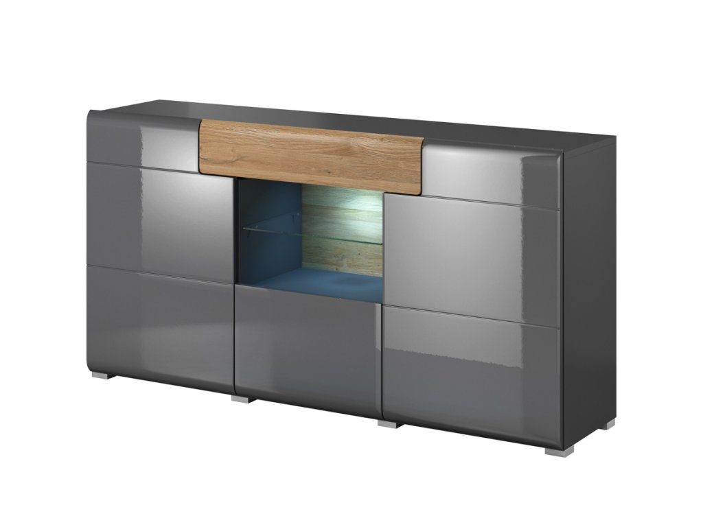 Komoda je třídveřová. Disponuje také jednou praktickou zásuvkou a prosklenou policí. Je možné dokoupit efektní LED osvětlení, které není v ceně komody.