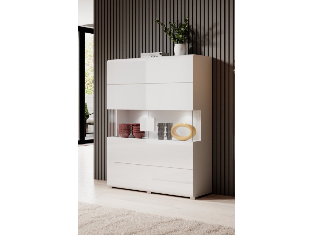 Je efektně rozdělena na prosklenou část a uzavřenou - úložnou část. Skleněné části nábytku jsou z tvrzeného skla a zaručují bezpečnost při používání. K nábytku lze dokoupit diskrétní LED osvětlení (není součástí nábytku). Barevné provedení je v žádané kombinaci bílá/bílý lesk.