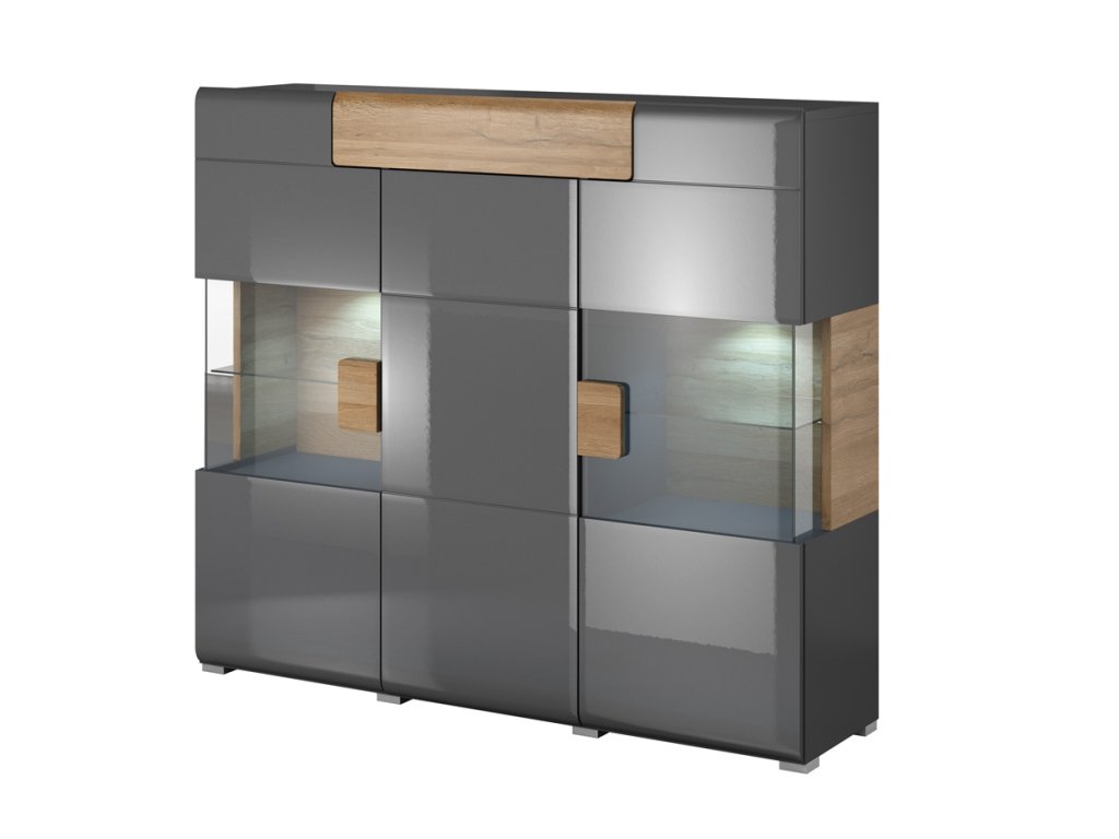 Komoda je třídveřová. Dvířka po stranách jsou z části prosklená. Je možné dokoupit efektní LED osvětlení, které není v ceně komody. Ve vrchní části je jedna praktická zásuvka.
