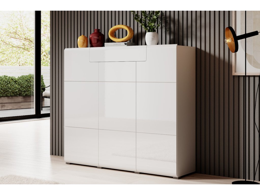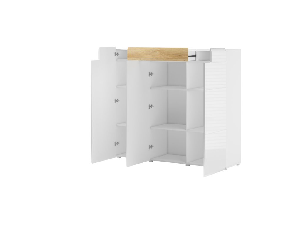 Komoda je z kvalitní LTD desky, která je nenáročná na údržbu . Přední části nábytku jsou potaženy membránovou fólií, která nábytku poskytuje dlouhou životnost. Barevné provedení je ve stylové kombinaci bílá/bílý lesk