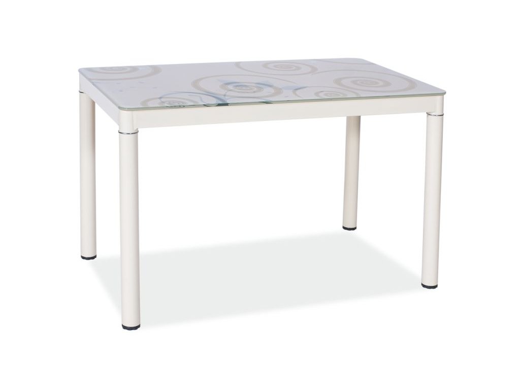 Zajímavý stůl do jídelny TAMAR s dekoračním vzorem pod vrchní skleněnou deskou. Konstrukce je z krémového kovu, vrchní deska je z tvrzeného krémového skla se vzorem květin. Je vhodný pro 4 osoby. Rozměry (výška/šířka/hloubka v cm): 75/80/60. Dodáváme v demontu. V nabídce také další barvy a rozměry.Doplňkové parametry