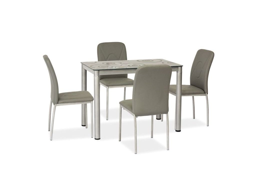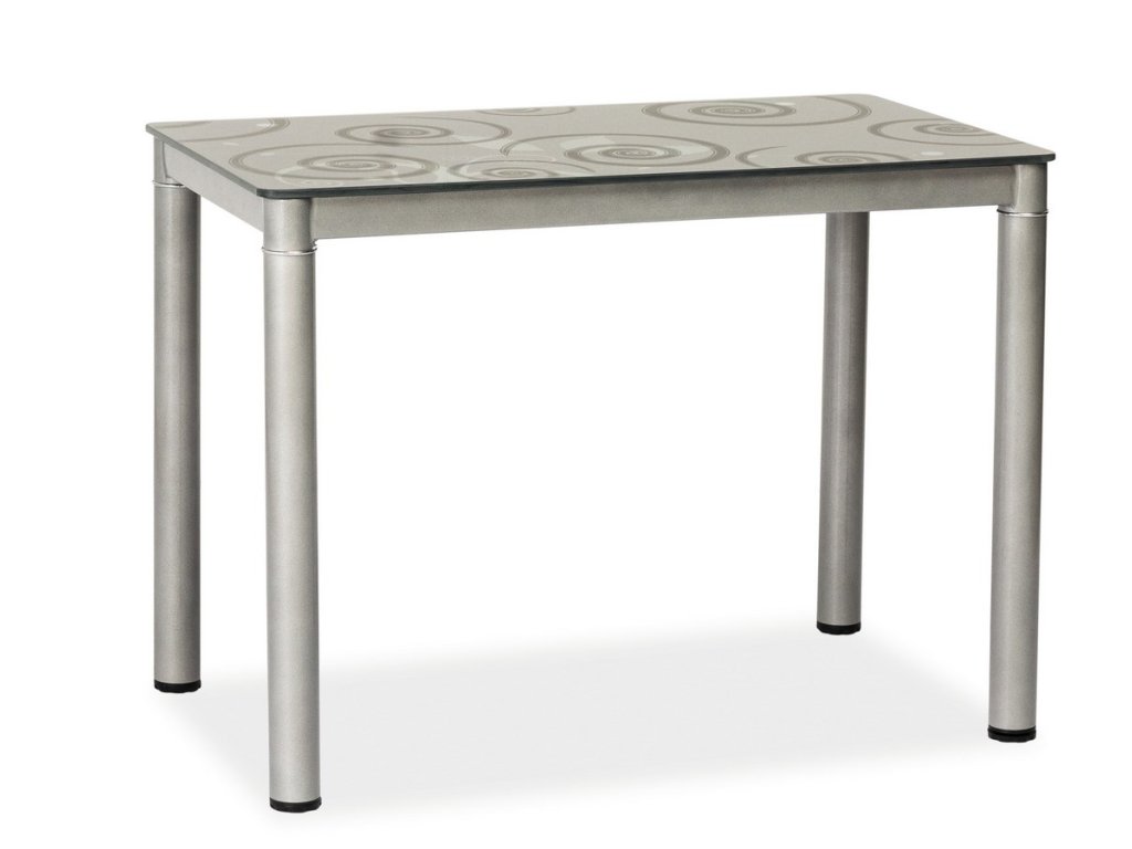 Zajímavý stůl do jídelny TAMAR s dekoračním vzorem pod vrchní skleněnou deskou. Konstrukce je z šedého kovu, vrchní deska je z tvrzeného šedého skla se vzorem květin. Je vhodný pro 4 osoby. Rozměry (výška/šířka/hloubka v cm): 75/80/60. Dodáváme v demontu. V nabídce i další barvy a rozměry.